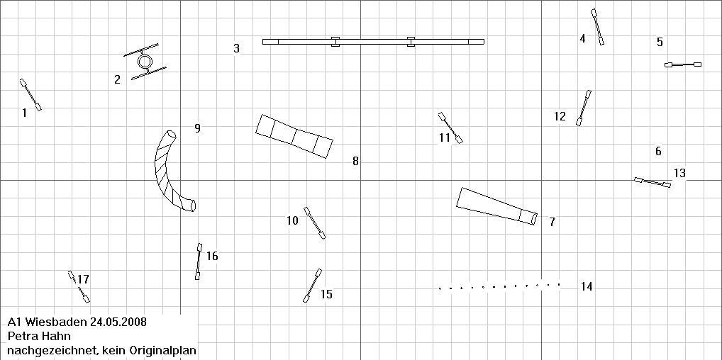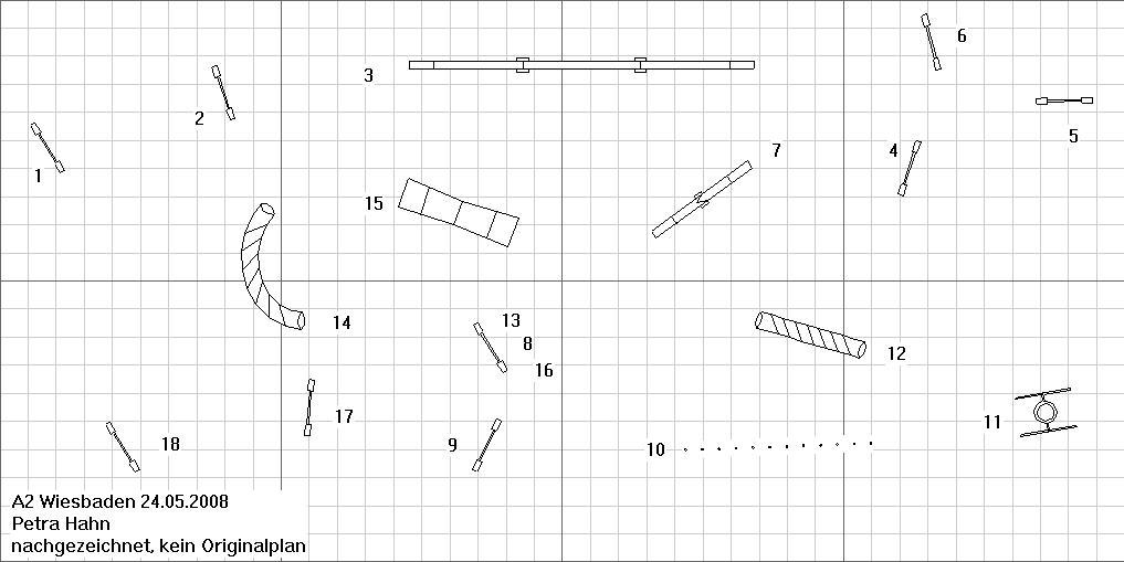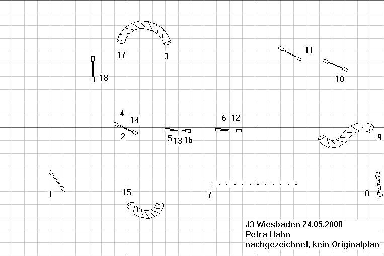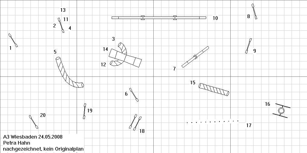24.05.2008 WiesbadenPremiere für den Verein, das erste Turnier. Nicht zuletzt weil auch viele nette Leute von anderen Vereinen mithalfen, war eine rasche Abwicklung drin. Haben sie gut gemacht. Richter war Petra "Jenny" Hahn, die mich diesmal mit ihren Parcouren richtig aus dem Konzept gebracht hat. Ich war noch ein wenig angeschlagen von Donnerstag, meine Bandscheiben hatten beschlossen, meinen linken Fuss ohne Gefühl zu belassen. Naja, dass heisst ja auch, dass er nicht schmerzt, ist ja auch machmal nicht schlecht. A-Lauf: bereits bei den A1+A2 glaubte ich an ein Déjà-vu, und wer mal hier schaut und die Parcoure in den Links mit meinen Bildchen vergleicht, weiss warum. Damals in Schriesheim hatte ich gerade meinen ersten A2-Start, irgendwie hab ich den damaligen Parcour mit dem aktuellen gut abgemixt und bereits nach Tunnel 3 den Faden verloren. Ok, wieder gefunden, ging gut bis zum Steg. Aufgangsfehler, Jenny hebt energisch den Arm und Laila springt daraufhin von ganz oben ab. Empfindliches Weib das. Da sie schon eine Pfote auf dem Abgangsteil des Steges hatte, wäre es zwar "nur" ein Fehler gewesen, ich hab sie allerdings den Steg noch mal wiederholen lassen, damit DIS. Laila auf dem Steg, Jenny hebt die Hand, Laila macht noch einen Schritt und springt dann zu mir runter. (Bild Klaus Wenzel) Laila beim Wiederholen des Steges, nun sichtlich gelöster ;-) (Bild Klaus Wenzel) Jumping3: das nächste Déjà-vu; als ich diese Parcoure das erste mal gesehen habe, war ich noch im A1 (Mainflingen 2006). Naja, der 3er war interessant, vor allem der Slalomeingang wurde von den richtig guten Teams (z.B. Martina mit Ally) Klasse gezeigt. Mein tauber Fus tappte während dem Slalom in irgend ein Loch, ich knickte um (toll, da hab ich dann wieder was gespürt) und ich hinkte mit Laila weiter. Sie rettete den Tunneleingang 9, allerdings in der zweiten Welle brachte ich sie mit meinem Gehumpel so aus dem Konzept, dass Stange 13 fiel. Noch schnell 1,6 Zeitfehlerchen und damit SG auf Platz 10. Laila springt über die nicht mehr vorhandene Stange 16. (Bild Klaus Wenzel)