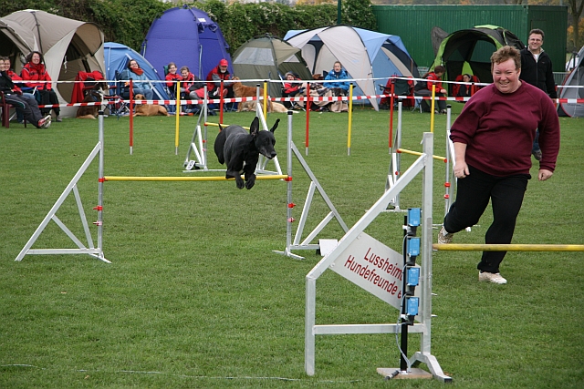 26.10.2008 Lussheimer HundefreundeEine durchgängige Leistung - 3 DIS am Stück ;-) Und das ausgerechnet bei Michael Kanbach, der recht einfache gut laufbare Parcoure stellte. Im A-Open und im A-Lauf hab ich die Grosse die Wand wiederholen lassen (natürlich wegen satten Aufsprüngen). Im Jumping hab ich sie zu arg nach vorn und damit über den falschen Sprung gedrückt, allerdings war das trotzdem ein schöne flotter Lauf, und wie man sieht, konnte nicht nur ich über das DIS lachen, auch der Richter fand unseren swhv-Jahresabschluss ganz lustig.