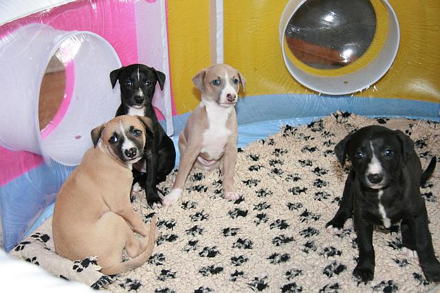 Ein süsses kleines Whippetmädchen gibt es da, das wohl bald bei uns einziehen wird. Noch sitzt es im Kreise seiner Brüder
