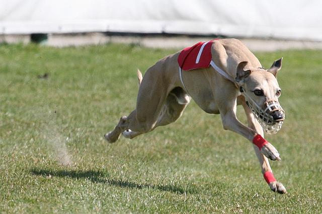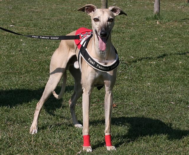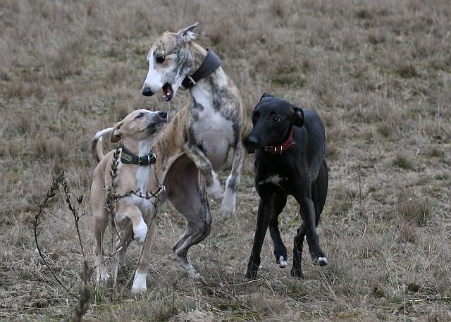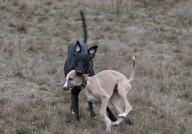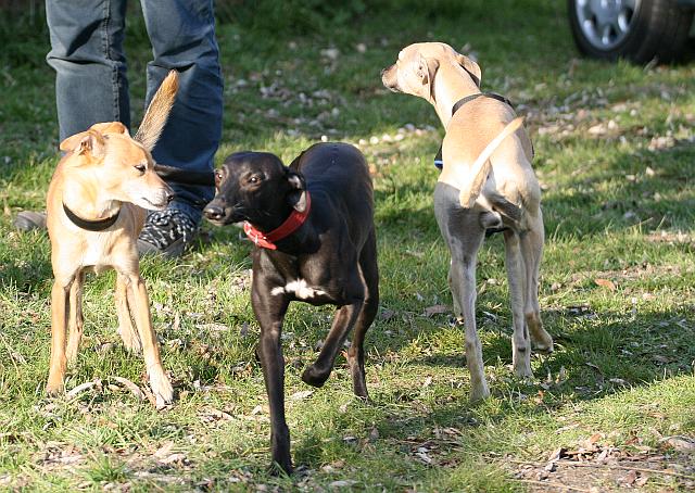 Auf der Rennbahn traf Iuju dann viele nette Whippets, die genau das selbe da hintrieb wie uns - die Whippetmessung. Erstmal spielte sie mit Quincy (Qsar vom Rauhen Meer), den fand sie echt fesch: