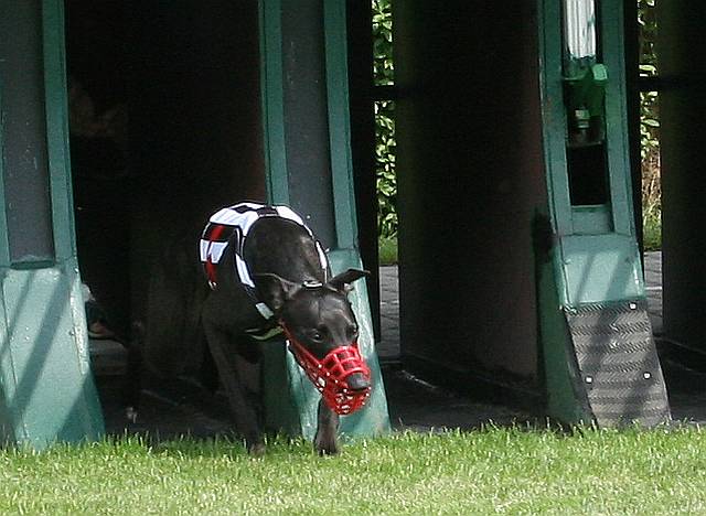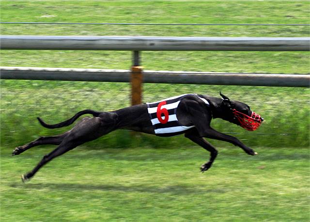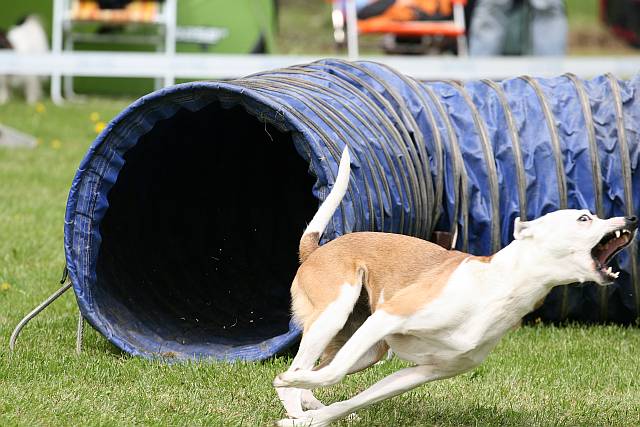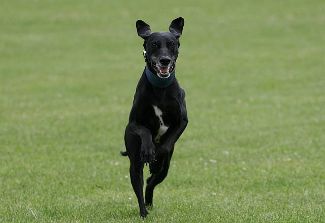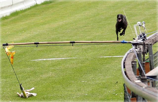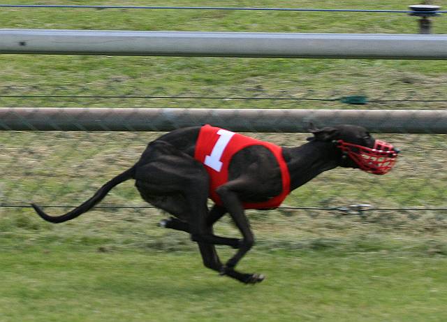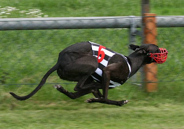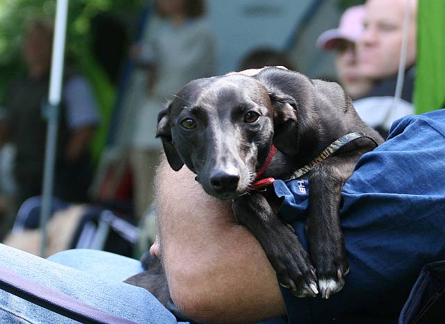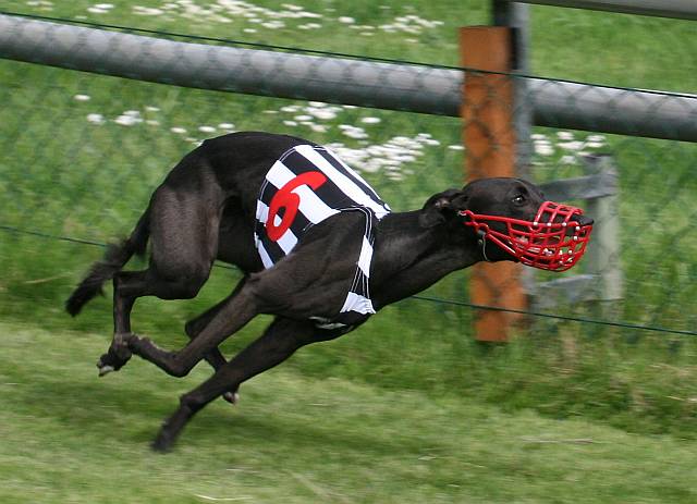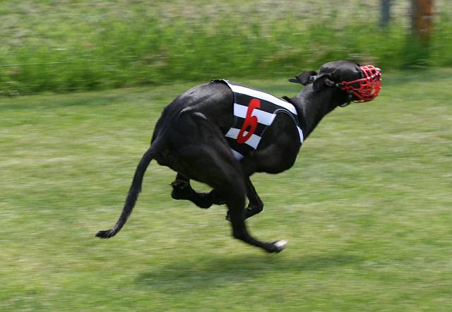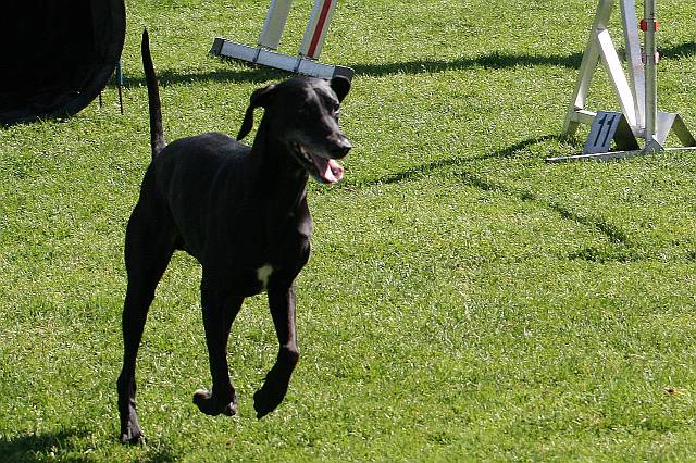 Weil sie beim Jederhundrennen nicht mitlaufen durfte (Windhunde dürfen nur mitmachen, wenn sie nicht auf einer Rennbahn trainieren), durfte sie zumindest einen Schaulauf machen, und sie hatte ein ganz grosses Vergnügen, endlich mal ohne Maulkorb in den Hasen beissen zu dürfen.