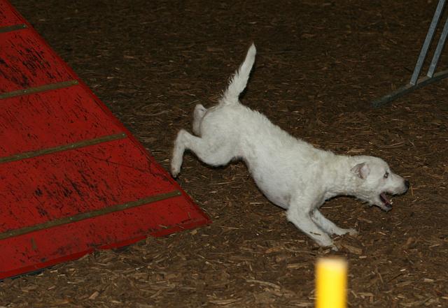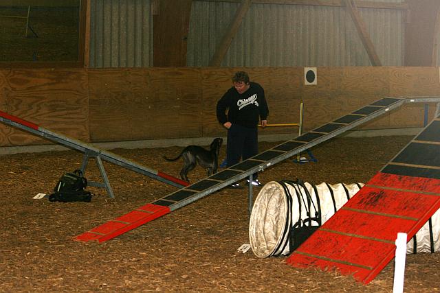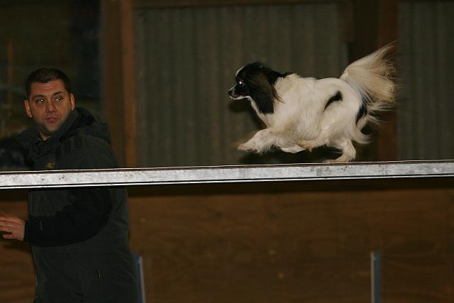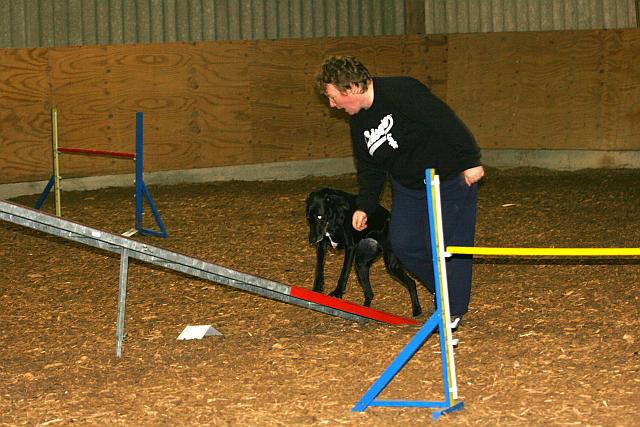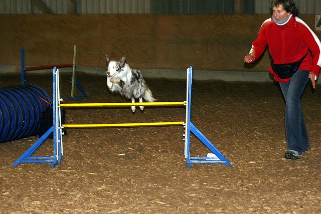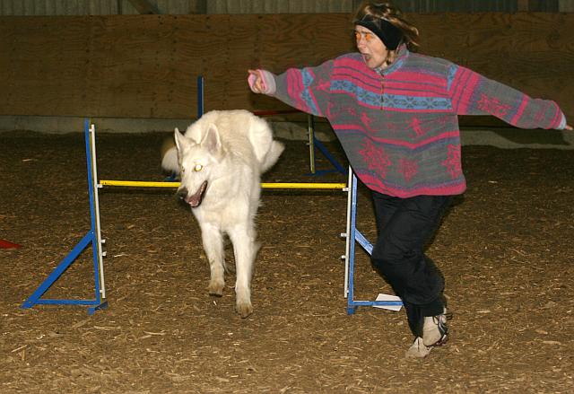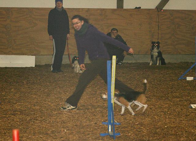23.01.2010 Agilitytraining in unserer Reithalle in HeidelbergEndlich wieder Samstag, und wir können in der Reithalle trainieren. Diesmal dabei waren Hakan mit Ginger, Karin mit Brice, Lisa mit Kyra, Steffi mit Emma, Nathalie mit Attila, Anke mit Sandy, Karin mit Sheilagh, Christiane mit Nike, Ralf mit Clyde und ich mit Laila und Iuju. Die Parcours stammten heute von der 2. AJO-Etappe (06.12.2009, Tanja Pollich), schnell wurden die Geräte aufgebaut und los gings. Die Steffi lacht, auch wenn Emma mal neben den Sprüngen herrennt