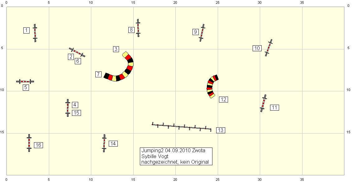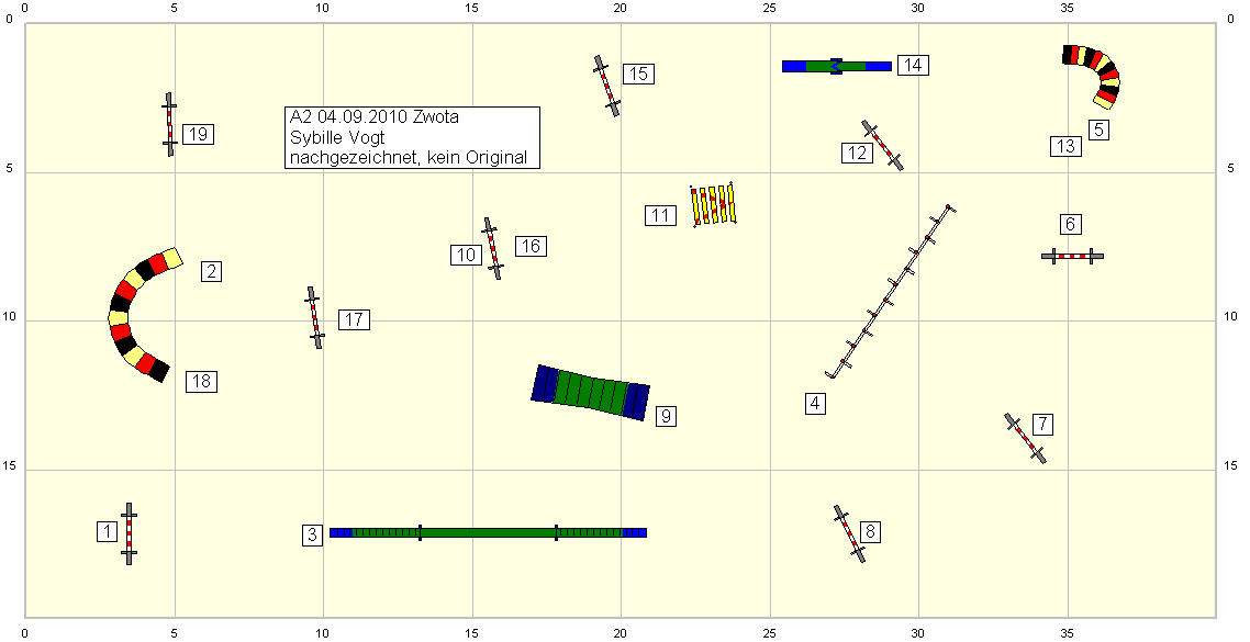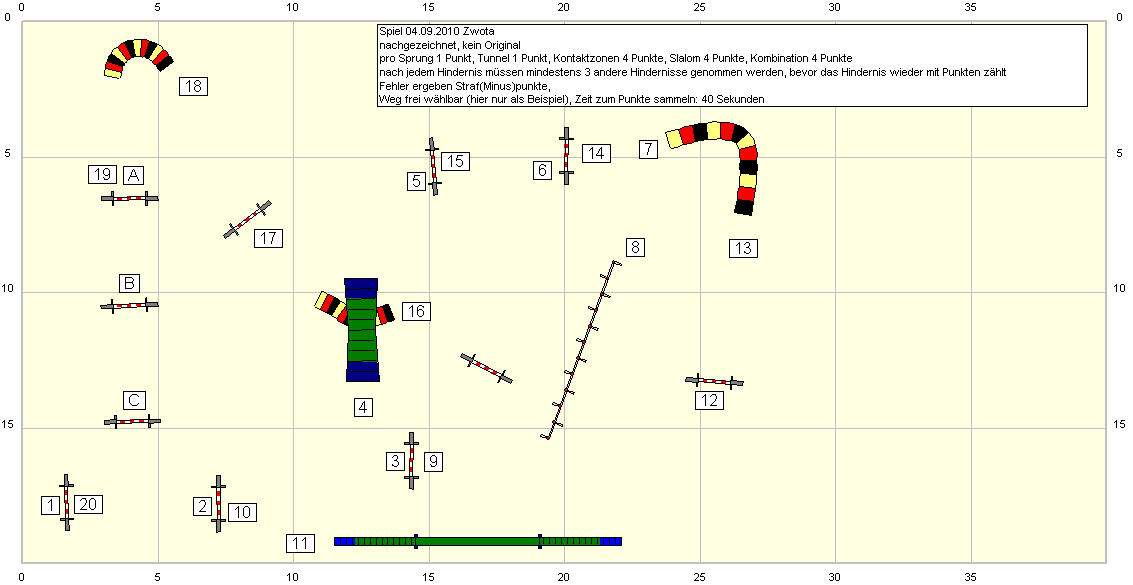 Nach der Siegerehrung konnte man gegen Gebühr noch an einem Spiel teilnehmen, so eine Art Monopoly-Clon. Die Sprünge und Tunnel zählten jeweils einen Punkt, Kontaktzonen, Slalom und Joker (in diesem Falle 3-fach Sprungkombination) jeweils 4 Punkte. Den Weg konnte man frei wählen, musste nur darauf achten, das mindestens 3 Geräte nach dem als letztes absolvierten Gerät kamen, ansonsten zählte das jeweilige Gerät nicht (also Wand-Tunnel-Wand-Tunnel-Wand-Tunnel-Wand-Tunnel würde nicht zählen). Fehler wurden mit Minuspunkten bestraft. Ich hab den Plan mal mit dem von mir gewählten Weg gezeichnet.