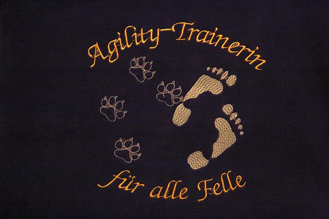 und mir dieses Gedicht vorgetragen hatten: "Für unsere Trainerin! Du kannst es schon lange nicht mehr hören, das Gejammer von den Gören Das ist doch viel zu Eckigda werd ich ja ganz checkig. Und immer dieses schnatterndie werden gleich laut gackern Mit viel Geduld hast Du's geschafft,gezeigt wie man es schafft. Das Jahr war voll mit Turnieren, Gezittert hast Du und gelacht wenn ein Team es dann geschafft. Im Training warst Du wunderbar Mit viel Fleiß, und Schweißmit Parcouren die warn sonderbar haben wir gelacht und Dich an den Rand des Wahnsinns gebracht. Doch Du bleibst unverdrossen und hast uns alle ins Herz geschlossen. Ein Jahr verging mal wieder wie im Flug, nach all den Plagen mit dem Haufenund es stellt sich uns die Frage: was ist es was Dein Herz erfreut? wollten wir Dir was besonderes kaufen. Was Schönes mit vier Pfoten, die Menschen sollen auch mit Voten. Dann war es wie ein Geistesblitz, ganz ehrlich, es ist kein Witz.gekauft und geschenkt mit Witz. Pack es aus und erfreu Dich, Bleib so wie Du bist, denn Du bist der Hit. Frohe Weihnachten und einen Guten Rutsch ins neue Jahr, da sind wir dann alle wieder da." schenkten sie mir noch eine wunderschöne Fleeceweste mit dieser Stickerei, über die ich mich wirklich von Herzen gefreut habe: