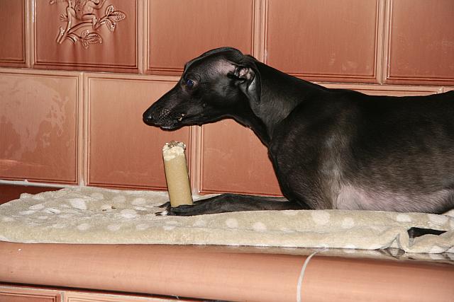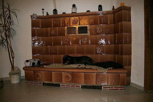 Danach macht es sich Iuju auf der Ofenbank bequem und geniesst ihr Geburtstagsgeschenk, einen leckeren Markknochen
