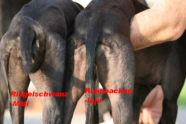 Der Gewinner des ersten Teils war übrigens Steffi, sie war am schnellsten, auch wenn sie eh schon kostenloses Agi-Training bei mir hat ;-) Ich bin übrigens ein grosser Fan der Aussage "Daumen dran"! Ich bin - ganz in Übereinstimmung mit der geltenden Gesetzeslage - der festen Überzeugung, das Amputationen des Daumens ohne medizinische Notwendigkeit Tierquälerei sind und sowohl der veranlassende Besitzer als auch der ausführende Tierarzt dafür zur Rechenschaft gezogen werden sollten. Auch wenn es früher mal so üblich war, auf diese Art und Weise eine Art "Krallenabrissprophylaxe" zu betreiben, wir schreiben heuer das Jahr 2010, und da sollte sich rumgesprochen haben, dass so eine Rolle Fixierbinde, die man für Rennen und Coursing benutzen kann und die wochenlang hält, etwa 7 Euro kostet, das Daumenamputieren hingegen die Hunde nicht nur den momentanen Schmerz erleben lässt, sondern sie auch für die Zukunft vorschädigt, weil die amputierten Hunde ein erheblich grösseres Arthritis-Risiko haben. Liebe Welpeninteressenten, bitte lasst Euch auf keinen Fall (auch bzw. vor allem nicht von irgendwelchen Züchtern) einreden, dass das Amputieren der Daumenkralle bei Welpen erstrebenswert wäre. Die von den Befürworten angeführten Argumente erinnern mich oft eher an die von Rosstäuschern, die irgend einen körperlichen Mangel des zu verkaufenden Tieres verbergen müssen. Und wer weiss, ob die Daumenkrallen dieser Welpen tatsächlich standartgerecht gewachsen waren, bevor sie unbedingt amputiert werden mussten? -------------------------------------------------------------------------------------------------------------- 11.07.2010 Verbandsiegerrennen Köln, diesmal lief es nicht so toll, Bericht hier -------------------------------------------------------------------------------------------------------------- 06.07.2010 Abends auf der Rennbahn, da lernt die Midi und ein paar andere Flitzepfoten ein ganz klein wenig Agility, ein paar Eindrücke davon gibts hier Und hier das Rätsel zum Sommerloch: wem gehört welcher Popo?