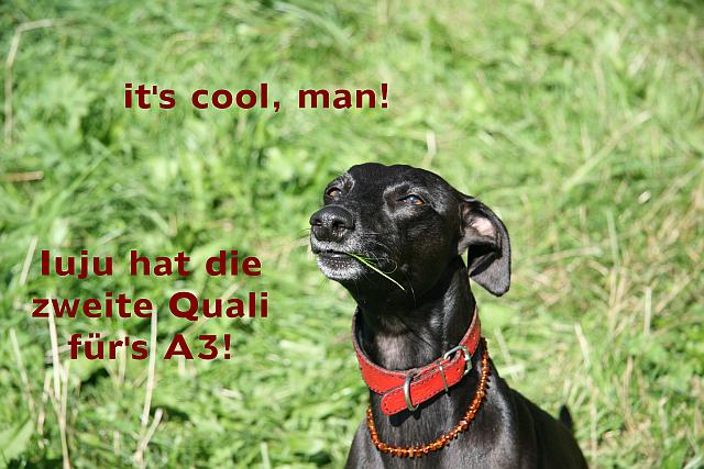 -------------------------------------------------------------------------------------------------------------- 25.09.2010 der erste Start im A3, es lief wie erwartet nicht so berauschend, Bericht und Parcourspläne hier -------------------------------------------------------------------------------------------------------------- 19.09.2010 es ist vollbracht, das Iuju ist in die A3 aufgestiegen! Bericht und Parcourspläne hier In Flörsheim holte sie sich im A-Lauf Platz 2