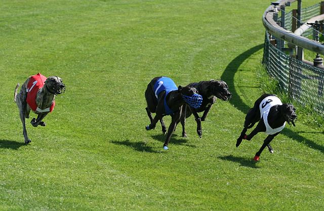 25.04.2010 9. Grasbahnmeister in Oberhausen-RheinhausenMachen wir es kurz, das war nix. Iuju ist in der Nachhitze, und ich hätte sie nie melden dürfen. In beiden Vorläufen hatte sie harten Körperkontakt mit der französischen Hündin, die deutlich erfahrener im Einsatz ihres Körpers als Iuju war. Im zweiten Vorlauf sogar so sehr, dass Iuju kurz quer stand. Das konnte sie kräftemässig einfach nicht schaffen. Und da die Bahn an diesem Tag sehr schnell war, war mit Zeiten von 23,45 und 23,64 nichts zu erreichen. Gewonnen hat unsere Vereinskollegin Bamboucha, der wir auf diesem Wege noch mal ganz herzlich gratulieren wollen! Iuju im zweiten Vorlauf unter Blau, Bamboucha unter Weiss