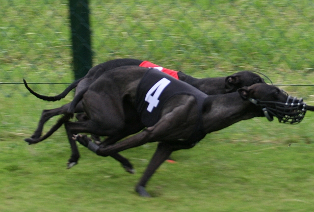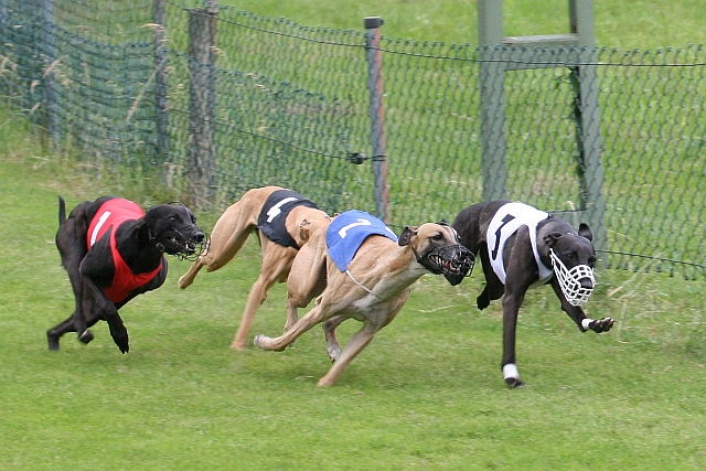 13.06.2010 Bundessiegerrennen FreiburgMit gemischten Gefühlen machten wir uns auf nach Freiburg. Iuju war im letzten Training problemlos 22er Zeiten gelaufen, so dass ich mir um ihre Form eigentlich nicht so viel Gedanken gemacht hatte. Allerdings war sie da allein unterwegs, und es sollte sich zeigen, dass sie dem Lauf im Feld momentan noch nicht so richtig gewachsen ist. In beiden Vorläufen startete sie unter schwarz, und beide Male wurde ihr die Box 6 zugelost. Das wäre nicht mal so übel, eigentlich mag ich die Box 6, da wird sie wenigstens nicht eingekeilt, aber diesmal sah es anders aus. Die Freiburger hatten ihren 350er Startkasten erneuert, dummerweise wohl aber das Stück Rasen direkt vor der Box 6 vergessen. Dort, und nur dort vor Box 6, erstreckte sich über etwa 2 Meter eine frisch angesäte tiefe Sand-Erde-Mischung, und die Hunde, die dort durchmussten, wühlten sich erst mal durch diesen Boden und verloren wertvolle Zehntel. Das der Boden in den Boxen indiskutabel tiefer weicher Sand war (siehe VDH -Rennordnung : "Der Boden muß griffig und möglichst ohne Höhenunterschied in die Gras- oder Sandfläche übergehen."), war letztendlich ein für alle Hunde gleiches, wenn auch unnötiges Verletzungsrisiko. Egal, Iuju hat beide Vorläufe verloren, sie kommt mit den körperlich überlegenen Hunden, die sie einfach abdrängen können, noch nicht klar und hat nicht genug gegenzusetzen, da muss noch ein wenig Zeit und Training ins Land ziehen. Heute war der 102 Tag der Nachhitze, da können wir sicher noch auf Besserung hoffen :-) Trotz der verlorenen Vorläufe war Iuju im B-Finale unter Weiss am Start, und sie kam tatsächlich auch auf Platz 3 rein.