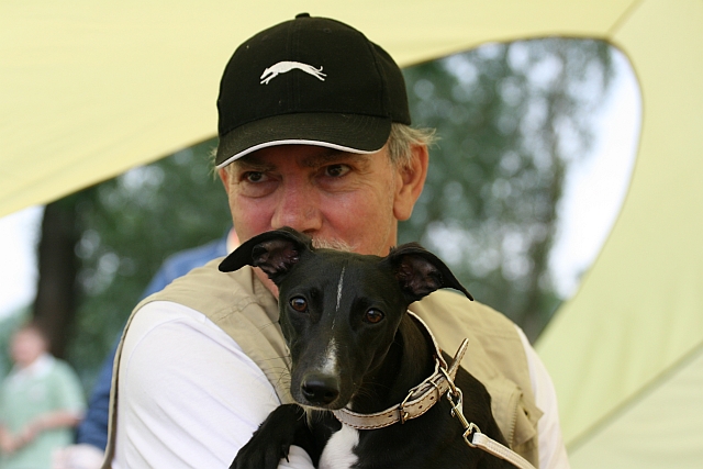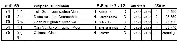 Ich hab mich über die Gelegenheit des B-Finales ehrlich gefreut, waren die Vorläufe doch schon kurz nach 11 Uhr zu Ende und aufgrund der Mittagspause bis 14:00 Uhr und der sich anschliessenden A-Finale hätten wir ja eh bis zur Papierausgabe gegen 16:00 Uhr warten müssen, so war zumindest noch ein schöner Trainingslauf im Feld für Iuju drin. Leider mussten ettliche der B- und C-Finalhunde zurückziehen, weil sie kleinere oder grössere Blessuren hatten, und ich finde es ausgesprochen unsportlich und überheblich, wenn (teilweise völlig ahnungslose) Aussenstehende sich über das Zurückziehen von Hunden mokieren. Erst mal selbst einen Hund auf der Bahn haben und die Verantwortung dafür übernahmen, dann kann man mitreden. Iuju im zweiten Vorlauf unter Schwarz, Bamboucha unter Rot