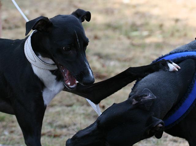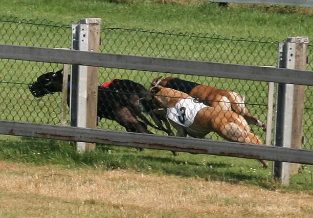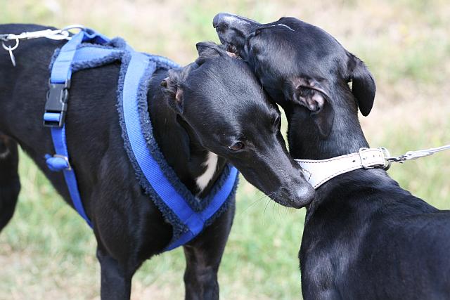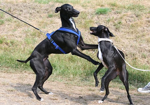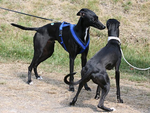 11.07.2010 Verbandsiegerrennen KölnAm Vortag waren wir angereist, die Temperaturen waren einfach mörderisch. In der Nacht ein Gewitter, dessen weniger Regen wenig Abkühlung, dafür aber mehr Schwüle am nächsten Tag brachte. Wir alle begrüssten es sehr, dass der Rennbeginn auf 7:00 Uhr vorgezogen wurde. Iuju hatte Lauf 4, zusammen mit Culann's Keelin, Ghan buri ghan's Gwiv Avel und Culann's Kimba Lee. Iuju wurde Box 6 zugelost, das war für mich ok, aber Iuju hatte da einen ziemlich schlechten Start und kam ewig nicht richtig vorwärts, so trudelte sie als Vierte mit 26,57 Sekunden ins Ziel. Das war die 10. Zeit der 15 am Start befindlichen Hündinnen. Welcher Teufel mich geritten hat, Iuju nun noch in den fakultativen zweiten Vorlauf zu setzen, weiss ich nunmehr nicht mehr. Fakt ist, das sie gegen Nadua vom Leineufer, Ulani el Schiras und Ghan buri ghan's Hazel Shade lief, und ausgerechnet letzterer auf der Gegengeraden laut Bahnbeobachter leider mehr als nur ein freundliches Lächeln zeigte, als Hazel sich zum Überholen aufmachen wollte. Warum das so passiert ist, da kann ich nur mutmassen, Iuju hat es mir nicht erzählen wollen. War es zu warm? Die Pause zwischen den Läufen zu kurz für Iuju? Bin ich zu ehrgeizig? Ist sie immer noch nachhitzebeeinträchtigt? Tut ihr was weh? Ich werde es wohl nie erfahren. Es ist leider Tatsache, dass ich da einen grossen Fehler gemacht habe, dessen Folgen nun zwei kleine Whippetmädchen trafen - Hazel, weil sie ihre Vorlaufzeit nicht verbessern konnte und deshalb nicht ins Finale einziehen konnte, und Iuju, die nun ihre erste DIS auf der Rennbahn hat. Jetzt ist erstmal Rennpause, ich werde das eine oder andere Mitarbeitergespräch mit Iuju führen und auch sonst versuchen, Iuju wieder auf gewohnte saubere Pfade zurückzuführen. Dieses Bild ist kurz vor der Situation aufgenommen, Iuju eine Kopflänge vor Hazel und dahinter Nadua und Ulani.