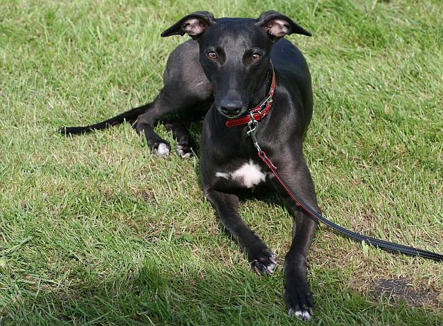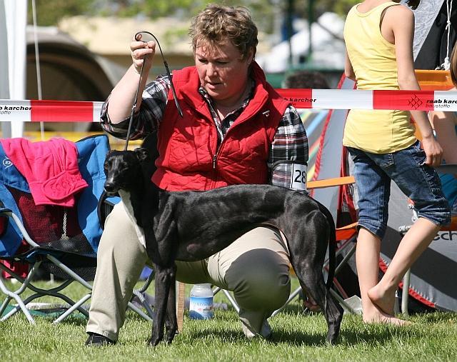 09.04.2011 Iuju und Midi bei der CAC-Spezialzuchschau in Oberhausen-RheinhausenMein Geburtstag, und offensichtlich hat diesmal nicht nur das Wetter gestimmt. Bevor ich mit meinen beiden Damen gelaufen bin, hab ich schnell noch Devaj Wizzard ausgestellt, fast hätte es da für ein V gereicht, aber das SG3 war auch ok und hat ihm am nächsten Tag das "S&L" in seiner Klasse gebracht. Dann die Midi in der Jugendklasse. Ich war auf ein SG aus, und als die Richterin uns zusammen mit einem recht freudlos laufenden Whippetmädchen relativ früh aus dem Ring geschickt hat, dachte ich, "sch... , nur ein G". Um so mehr hab ich mich gefreut, auf der Anzeigetafel dann ein V zu finden! Und wie im Vorjahr derIuju hat diese Bewertung dieses Jahr der Midi am nächsten Tag das S&L gebracht.