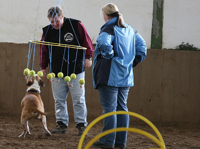 Bälle hängen da, und unter den Bällen hängen noch Leckerchen, und Hund wählt einen Ball aus. Die Nummer, die auf dem