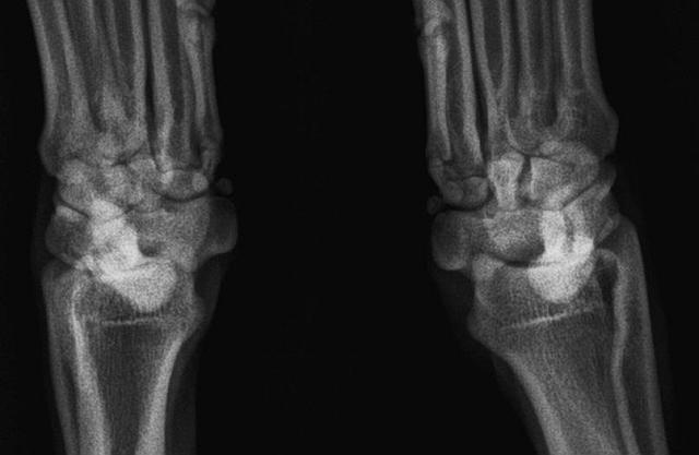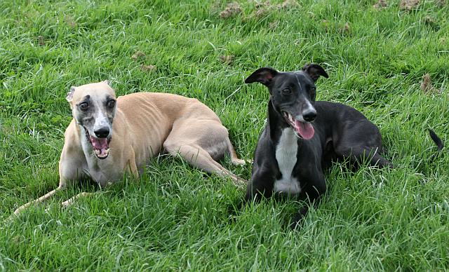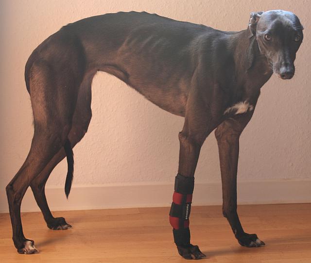 Ich bin nach dieser ersten Diagnose mit Iuju auf Empfehlung anderer Rennhundebesitzer in die Niederlande zu Dr. Dijkshoorn gefahren, um Iuju untersuchen und gegebenenfals operieren zu lassen. Glücklicherweise meinte Dr. Dijkshoorn bereits nach der manuellen Untersuchung, dass wohl die Bänder ordentlich überdehnt sind, aber sich sonst alles intakt anfühlt. Den Stein, der mir da von der Seele plumpste, muss man wohl bis nach Hause gehört haben. Drei neue Röntgenbilder in verschiedenen Ebenen bestätigten seine Aussage, gerissen ist nix. Also gab es eine Injektion ins Gelenk, und die strikte Anweisung, 3 Wochen Leinenzwang einzuhalten und in der vierten Woche mit der Aktivierung zu beginnen.Dr. Dijkshoorn meinte sogar, dass Iuju zum Ende der Saison wieder Rennen laufen könnte. Warten wir es mal ab. Laila übernimmt die Krankheitsvertretung im Agility, und Midi hat versprochen, Iuju bei Rennen würdig zu vertreten. Iuju hat zur Sammlung von Accessoirs nun noch eine Karpalgelenk-Bandage von Benecura hinzugefügt, die ihr helfen wird, das Beinchen zu schonen.