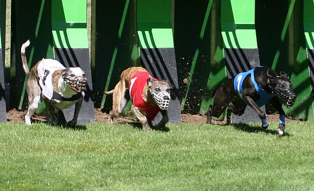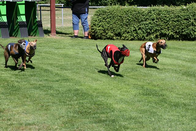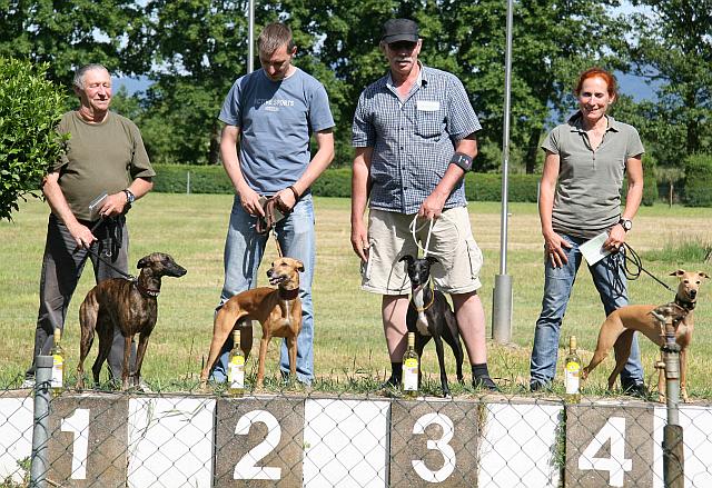 29.05.2011 Freiburg „Grand Prix d´Europe“Beide Mädels sollten am zweiten Lauf des Grasbahncups teilnehmen. Also auf in den Schwarzwald. Midi war als Erste dran und traf in der gemischten Grundklasse auf Snap dogs Harmony, Storktown's Observer und Culann's Nevada. Harmonie und Nevada waren als Widerunner eingetragen, Nevada hatte sich Box 6 erbeten, also blieb für Harmony die 5 und Midi und Diego wurden gelost. Midi war letztendlich auf Box 3 und Diego auf 2. So sah der Start aus: