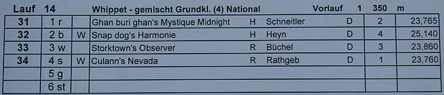 Nun, ich werde also wieder auf Mitarbeitergespräche und Einzeltraining zurückgreifen, hoffentlich wirkt es wieder. Also war Midi allein im Finale und Iuju durfte nur zuschaun. Die Finalzusammensetzung war original die gleiche wie beim Vorlauf, inclusive Boxenwahl. Diesmal kam Diego super gut weg, und alle anderen stürmten ihm hinterher. Dabei hat Midi heute mal etwas versucht, was mich ein bissl Hoffung schöpfen lässt. Als aussen durch die beiden Widerunner alles dicht war, hat sie versucht, innen durch zu gehen. Hat leider auch nicht geklappt, und der erneute Aussenweg hat Zeit gekostet, aber es lässt mich immerhin hoffen, dass sie sich noch eine andere Strategie zulegt. Schliesslich kam sie hinter Nevada und Diego als Dritte über die Ziellinie.