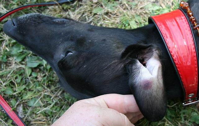Im Nachhinein geht es mir ja wie vielen Menschen - hinterher bin ich immer mal wieder schlauer als vorher. Ich hab mich schlagartig an das kleine wilde Spiel erinnert, an dem Iuju diese Woche teilgenommen hatte und das ihr offensichtlich ein bissl zu arg war. Sieht so aus, als ob sie befürchtet hatte, noch einmal so in die Klemme zu kommen wie bei dem Rennspiel, und sie wollte vorbeugen. Wird ein hartes Stückchen Arbeit, sie davon zu überzeugen, dass sie sowas auf der Bahn nicht darf... Das ist übrigens der blaue Fleck, den Iuju von dem Spielchen derzeit im Ohr mit sich trägt, natürlich auf der Seite, auf der Ylenina Iuju so nahe kam.