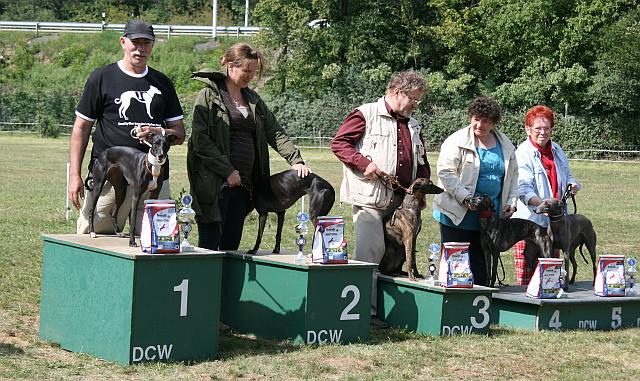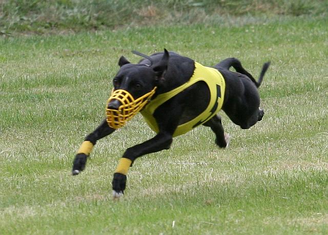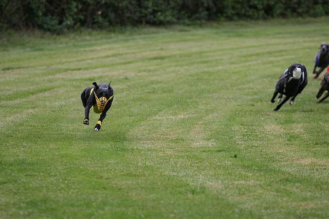 03.07.2011 Heinerfest in DarmstadtNachdem beide Mädels am Vortag tapfer bei der Ausstellung durchgehalten hatten, durften sie auch beide laufen. Iuju sollte zeigen, dass sie keine Nachwehen von Freiburg mit sich rumschleppte. In der gemischten A-Klasse lief sie nur gegen Boston vom Brunkland und Dèvaj Wizard. Der Vorlauf war von mehreren sauberen Positioswechseln geprägt, zum Schluss konnte Iuju sich durchsetzen und gewann den Vorlauf. Midi hatte als Gegnerinnnen in der Grundklasse die Ela, die Chinooga, die Cherilynn und die Celine. Das erste Mal also gegen 4 andere Hunde. Offensichtlich hat sie das angespornt; obwohl sie wieder ganz aussen gelaufen ist, gewann sie den Vorlauf. Midi unter Gelb beim Vorlauf, wie gewöhnlich zog sie ihre Bahn ganz Aussen, unser kleiner Komet.