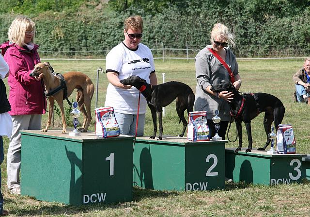 Dann die Finale. Iuju hatte es sich zum Mittagsschläfchen im Startkasten bequem gemacht und war etwas verdattert, dass das Ding aufging. Dann beschloss sie doch, dass sie den Hasen haben wollte und rannte den Jungs hinterher. Ganz gereicht hat es nicht, Boston siegte knapp vor ihr, Iuju kam vor Wizard auf Platz 2.