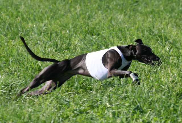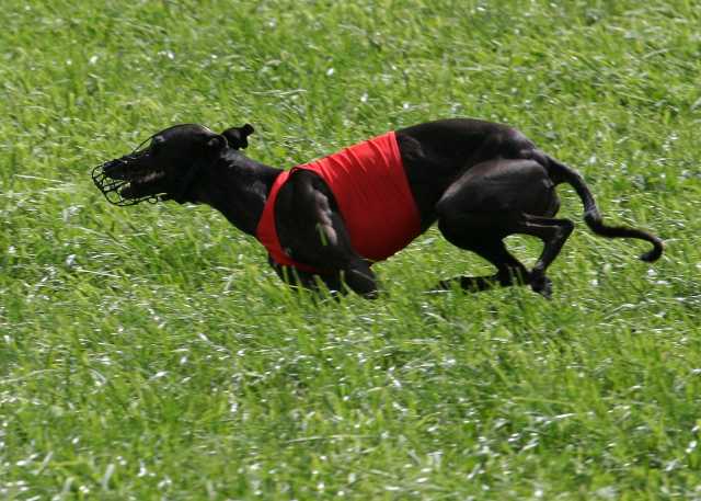 ja auch so was ähnliches wie Deutsch ;-) Ein richtig tolles Starterfeld mit 38 gemeldeten Whippethündinnen erwartetete uns laut Programm, von denen schliesslich 37 am Start waren, das war echt grossartig! Soviel Konkurrenz kennen wir sonst nur vom Agility. Wir sind schon einen Tag zuvor angereist, in der Nacht hat es richtig viel geregnet, aber der Wettkampftag war von viel Sonne und recht starkem Wind geprägt, der Himmel war gnädig und schickte keine weiteren Regenwolken. Kurz vor Iujus erstem Start bemerkte ich, dass ich meine Maulkörbe zuhause vergessen hatte. Glücklicherweise konnte ich mir einen Drahtmaulkorb von einer lieben Bekannten leihen, aber Iuju hatte sowas noch nie aufgehabt und so ganz optimal gepasst hat er halt auch nicht. Ob das der Grund war, das Iuju beim ersten Durchgang ein paar Probleme hatte, oder ob es am ungewohnten Hasenzugsystem (Endlosanlage) lag? Keine Ahnung, das werden wir wohl nie erfahren. Nach dem Lauf hat Iuju sogar mal kurz geautscht, sie hatte einen Mini-Cut an der Lippe, eventuell war es deshalb, vielleicht hatte sie sich auch vertreten. Wie auch immer, für diesen Lauf erhielt sie nur 164 Punkte, obwohl sie natürlich als Erste am Hasen war. Aber ich glaube mittlerweilen fast, Jagderfolg ist nicht das wirkliche Ziel beim Coursen. der geliehene Maulkorb ein wenig schief auf der Nase Ich hab also mein Spätzchen ein wenig schlafen gelegt, um nach dem Abbau des Adrenalinpegels in ihrem Blut noch mal nachzusehen, ob sie sich irgendwas gezerrt hatte. Letztendlich war aber nur der rechte hintere Aussenzeh ein wenig empfindlich, keine Schwellung, keine Bewegungseinschränkung, kein palpatorischer Schmerz, keine sichtbare Verletzung. Nur wenn Iuju über Kies gelaufen ist, war ihr das sichtbar unangenehm, das kenne ich allerdings schon recht lange von ihr, für gewöhnlich lässt sich Prinzessin über Kieswege drübertragen.... Also habe ich sie auch ihren zweiten Lauf machen lassen. Dabei hat sie mich dann wieder unheimlich überrascht. Ich bekenne ja, dass ich vom Coursing nicht allzu viel Ahnung habe. Aber was sie da gezeigt hat, fand ich einfach nur geil. Oder um es mit den Worten einer Agility-Kollegin auszudrücken: "Halli-Galli-Drecksau-Party"! Man, hat sich die Iuju ins Zeug gelegt. Das wurde auch von den Richtern honoriert, für diesen Lauf erhielt sie 180 Punkte. Wenn ich nun bedenke, dass der Gesamttagessieger über alle Rassen an diesem Tag für beide Läufe in Summe 361 Punkte erhalten hatte, dann war das doch ein ganz ordentliches Ergebnis, oder? Insgesamt kamen wir aber durch die schlechte Bepunktung aus dem ersten Lauf 'nur' auf Platz 16 von 37, was immerhin unter den ersten 50 % des Starterfeldes war. Also damit war ich schon zufrieden. ![]() Iuju bei der "Halli-Galli-Drecksau-Party" ;-) |
