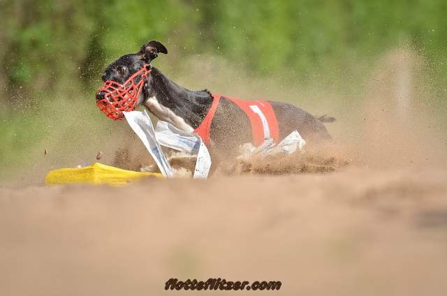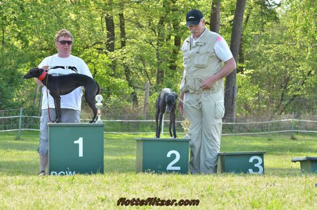 01.05.2012 Solorennen DarmstadtImmer wieder ein toller Spass, das Solorennen in Darmstadt. liebevoll vorbereitet, ein kleiner lustiger Teilnehmerkreis ohne riesige Gewinnambitionen, ja, auch das kann Rennsport sein. Früh war es noch ein wenig bedeckt und kühl, doch die Sonne meinte es wieder gut mit den Darmstädtern und der Tag wurde angenehm warm. Bei den Whippet-Hündinnen waren nur 3 Mädels am Start, neben Iuju und Midi lief noch Ella mit. Im ersten Vorlauf war Midi wohl noch nicht so recht wach, mit 23,41 blieb sie weit hinter ihren Möglichkeiten. Iuju dagegen stellte mit 23,09 ihre neue Darmstädter Bestzeit ein. Beim zweiten Lauf war es dann schon gegen 16:00 Uhr recht warm, so das die Zeiten im allgemeinen eher wieder schlechter wurden, Midi verbesserte sich aber auf 23,21, während Iuju mit 23,15 ins Ziel kam. Damit landete Midi auf Platz 2, und Iuju mit der besten Laufzeit des Tages aller anwesenden Hunde auf Platz 1.
