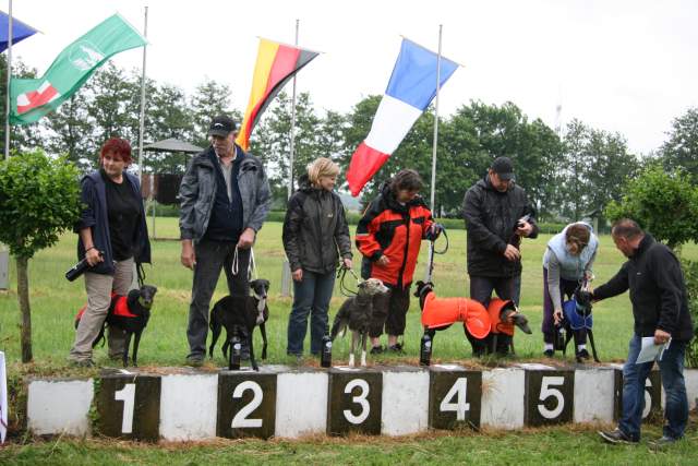 03.06.2012 Grand Prix d'Europe in FreiburgMidi's erstes A-Klasserennen. Iuju hatte ich zwar als Auffüller mit gemeldet, falls kein 6er Feld für das CACIL zusammenkommen würde. Aber da ausser Midi noch 5 weitere Hündinnen da waren, hab ich Iuju wieder zurückgezogen, ich muss sie ja nicht unbedingt mit Midi zusammen laufen lassen und bei 6 Hündinnen gibt es zudem nur den ersten Vorlauf und das Finale, das war bei dem am Renntag herrschenden Wetter eh besser. Im Vorlauf war Midi also