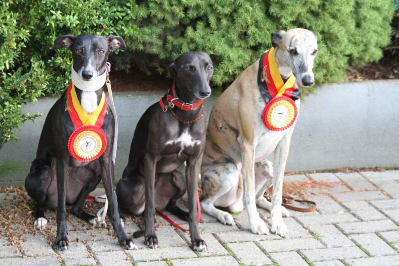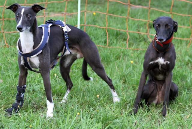 langweilen... Iuju ist im ersten Lauf gegen Nine Lives Light up the Sky schön gerannt, obwohl ich ein wenig Bammel vor der nassen tiefen Wiese hatte, alles heil geblieben. Midi gegen Betty Barkley Lambada hat irgendwo in der Wiese eine Seitwärtsrolle veranstaltet, aber ohne auch nur einen Sekundenbruchteil später die Verfolgung fortgesetzt. Patschnass und mit ein paar oberflächlichen Kratzern warf sie sich auf den Hasen, und ich hatte Mühe, sie vor der Zerstörung des nächsten Maulkorbes zurückzuhalten (das ist offensichtlich ihr Verständnis von 'Hasen fangen'). Das Punktekonto nach Lauf 1: Iuju 83 Punkte gleichauf mit Culann's Mystery auf Platz 5-6, Midi punktgleich mit Culann's Kimba Lee auf Platz 1-2. Whow! Das Schnattchen ganz vorne mit. Aber wir wissen ja : Schluss ist erst, wenn die fette Dame singt! Also schön Lauf 2 abwarten und dann mal schauen. Iuju durfte im zweiten Lauf mit Crazy Runner's Felicity antreten. Leider passierte hier, was im zweiten Durchlauf ziemlich oft vorkam: die Hunde verloren den Hasen! Lilli hatte den Hasen dann etwas eher als Iuju, die den Lauf schon für beendet glaubte und deshalb erst mal Pipi machen musste :-) Aber schliesslich hat sie den Hasen auch noch gesehen und die letzten Meter Gas gegeben, um ihn zu kriegen. Trotzdem, der Lauf war kaputt, und Iuju wurde punktemässig ganz nach hinten durchgereicht. Naja, wer das Pech nie kennenlernt, wird das Glück beim nächsten Mal nicht zu schätzen wissen! Midi hat hingegen einen schönen zweiten Lauf hingelegt, viele 'turn-on-a-sixpence' Aktionen habe ich gesehen, schönen Speed, ordentlicher Kill, da konnte man auf eine Platzierung hoffen! Und die gab es dann auch, am 21.09.2013 wurde Midi "Deutsche Vize-Coursingsiegerin" (hier mit Pechvogel Iuju und Iujus grossem Schwarm Jasper, der den 4. Platz in seiner Klasse erkämpfte). ![]() Ein Schmankerl am Rande der Veranstaltung: Iuju traf zum ersten Mal seit Welpenzeiten wieder ihren Bruder Inda-Nischo. Ein ganz süsser Kerl, und keiner von Beiden kann das Geschwisterchen abstreiten, genau wie bei Murphy besteht eine nahezu unheimliche Ähnlichkeit (die Beiden ähneln sich sogar akkustisch, der selbe Wutschrei, wenn sie Anderen beim coursen zuschauen müssen!). ![]() |