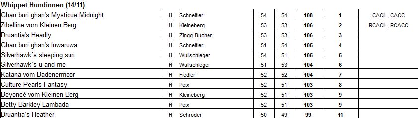 probieren :-) Und man weiss ja nie, ich hab vorsichtshalber mal Midi mitgenommen, damit sich Iuju nicht so langweilt. Midi durfte dann direkt im ersten Lauf gegen Katana vom Badenermoor antreten, Katanchen hatte ihr Coursingdebüt und schlug sich wacker, Midi holte jedoch kurzerhand mal 54 Punkte aus diesem Lauf und lag damit gleichauf mit Silverhawk' sleeping sun auf Platz 1. Iuju gegen Silverhawk's u and me, keine Ahnung, was den Richtern an dem Lauf nicht gefallen hat, beide Mädels wurden nur spärlich bepunktet, so dass Iuju nach diesem Lauf irgendwo am Ende des Feldes lag. Die ganze Zeit über regnete es schon, vielleicht wollte Iuju deshalb nicht so richtig coursen, sie ist bei Regen ja ein bissl eigen :-) Dann setzte sogar noch Starkregen ein, und der Veranstalter informierte uns, dass nach einer Pause eine Begehung des Geläufes durch das Schiedsgericht geplant wurde, um festzustellen, ob ein zweiter Durchgang gezogen werden konnte oder ob nach den Resultaten des ersten Durchgangs gesetzt werden musste. Als es dann soweit war, entschied man sich dafür, den zweiten Durchgang als seeehr vereinfachten Kurs im Innenraum der Bahn zu ziehen, einmal im Kreis mit ein paar kleinen Zickzacks. Naja, da war mir schon klar, dass das den Mädels liegt. Beide sind auch brav geflitzt, es sah ganz gut aus, also hoffte ich doch zumindest für Midi auf eine Platzierung. Leider hatten aber nicht alle Hunde das Glück, so gut mit dem Rundkurs zurecht zu kommen, man sah ein paar Überschläge, ein Pärchen hatte auch den Hasen verloren. Die Siegerehrung: zu meiner grossen Überraschung hatte es Iuju tatsächlich noch auf Platz 4 (von 11 Hunden) geschafft. Und dann die Bombe: Midi gewinnt ihr Coursing, und damit hat sie das zweite CACIL gewonnen, und das zweite CACC holt sie sich auch. Ausserdem hat sie jetzt auch noch die Voraussetzungen für das Working class certificate in der Tasche. Was für ein schöner Jahresabschluss! ![]() |