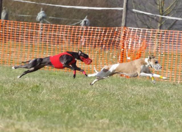haben, die wissen gar nicht, was sie verpasst haben! Für die Mädels hatte ich den Plan: Iuju holt sich das letzte fehlende CACC, und Midi bewegt sich mal ein bisschen und ist hinterher wieder ein wenig führiger. Man merkt, das es lange keine Hasis zu jagen gab, die Weiber werden immer unleidlicher und „guggiger“, es wird allerhöchste Zeit, dass die Saison wieder beginnt. Midi ist in der Nachhitze, und auch wenn sie keine typischen Scheinträchtigkeitssymptome zeigt, ist sie doch ein wenig pummelig, hat fast ein Kilo zuviel auf den Rippen und ist demensprechend nicht in Topform, aber für ein bissl Hasijagen sollte es reichen. Liebe Freunde haben wir auch wieder getroffen, das war auch gut so, denn da nur 3 Whippetmädchen am Start waren, hatte ich 2 Läufe direkt nacheinander und das geht nur mit Hilfe :-) Im ersten Lauf war Midi gegen Avalons Piece of a Dream unterwegs, und die kleine „Geena“ machte Midi ordentlich die Hölle heiss. Diesmal lag ich mit meiner Einschätzung richtig, Midi erhielt weniger Punkte als Geena für diesen Lauf. Danke an Vanessa Flüge für das Bild!Dann Iuju, die mit dem ersten Whippetrüden laufen durfte. In diesem Fall Devaj Apollo, mit dem sie auch schon oft auf der Rennbahn trainiert hat. Das war wieder ein richtig schöner Lauf, bei dem zwei ebenbürtige Gegner richtig schön um den Hasen gekämpft haben. Iuju lag damit mit 10 Punkten Vorsprung bei den Mädels vorn :-) Zweiter Lauf, nun Iuju mit Geena, der Parcours war m.E. deutlich einfacher, zum Schluss regelrecht eine Rennstrecke, naja, was soll ich sagen, wie üblich hat Iuju eine „Halli-Galli-Drecksau-Party“ veranstaltet, Geena hatte nicht den Hauch einer Chance. Nur am Hasen, da wollte sie es dann noch mal wissen, und da sie da recht ähnlich wie Iuju drauf ist, hatte ich kurz Schwierigkeiten, die beiden wilden Weiber auseinanderzupflücken. Iuju hatte den Hasen nämlich ungeplant etwa 15 Meter vor dem eigentlichen Hasentod schon eingeholt und gekillt, so dass Geenas Herrchen und ich nicht darauf gefasst waren, dass der Schauplatz vorverlegt wurde ;-) Danke an Vanessa Flüge für das Bild!Midi durfte ihren zweiten Lauf mit Laurin als Begleithund machen, Laurin hatte leider im ersten Lauf gemeint, mit seinem Stallkollegen Thunderbolt Fergus spielen zu müssen, und war damit aus dem Wettkampf ausgeschieden. Da ich mir jedoch sehr sicher war, dass Midi nicht mit ihm spielt und der Kurze sich ordentlich anstrengen muss, selbst wenn es „nur“ gegen die Nachhitze-Midi geht, habe ich darum gebeten, Laurin als Begleithund zu bekommen, damit Midi nicht allein laufen muss. Und tatsächlich, mit dem Rüden an der Seite ist auch die Midi ein bissl wacher geworden, und die Rennstrecke lag ihr ja sowieso, also hat sie sich gegen Lauf 1 noch mal ordentlich verbessert. Bei der Siegerehrung stand sie zwar auf Podestplatz 3, das war aber nur einem kleinen Sortierfehlerchen geschuldet, in der Liste war dann klar, dass sie mit 4 Punkten Vorsprung vor Geena auf Platz 2 gelandet war. Liebe Freiburger, das war ein tolles Fest, wir kommen gerne wieder! _________________________________________________________ Gerade eben kam die Email vom Verband: "es freut uns Ihnen mitteilen zu können, das Ihre Whippet Hündin WH 15371 Ghan buri ghan’s Iuwaruwa das Coursingchampionat erreicht hat." |
