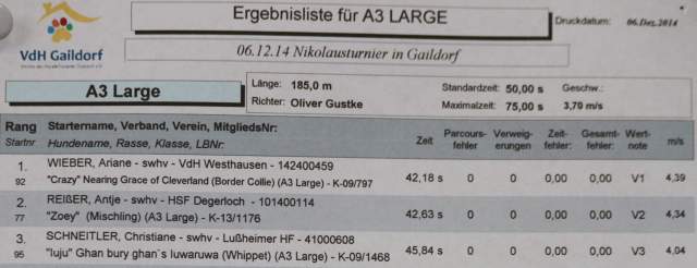 Petra Ohrmundt schaffte es trotz seiner 17 Jahre ganz locker auf Platz1! --------------------------------------------------------------------------------------------------------------![]() -------------------------------------------------------------------------------------------------------------- 20.12.2014 und hier ist nun Lailas Jungbrunnen - we proudly present Ecstasy of Villa Whippet! ![]() Die kleine Kuschelmaus ist heute bei uns eingezogen und ergänzt unser Rudel um einen süssen lustigen Wonneproppen. Natürlich hat sie auch schon ihre eigenen Seiten :-) -------------------------------------------------------------------------------------------------------------- 20.12.2014 Laila feiert ihren 14. Geburtstag! Happy birthday, mein Lailamädchen! 14 Jahre wirst Du heute jung, und auch wenn das Gesichtchen langsam grau wird, Du mich nicht mehr hören kannst und die Augen nicht mehr so richtig wollen, Du versüsst mir mit Deinem Dalmatinerlachen immer noch jeden Tag. Heute nun wirst Du ein ganz besonderes Geschenk erhalten, sozusagen einen kleinen Jungbrunnen, auf dass Du fit bleibst und uns noch ganz lange begleiten kannst! ![]() -------------------------------------------------------------------------------------------------------------- 06.12.2014 Agility in Gaildorf, Iuju holt sich im A-Lauf und im Jumping, in der Kombiwertung gibt das , Bericht hier![]() | ||