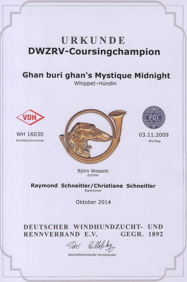 -------------------------------------------------zurück zu den News-------------------------------------------------26.10.2014 Coursing in Landstuhl, Bericht hier, jetzt geht es erst mal in die Winterpause :-) --------------------------------------------------------------------------------------------------------------![]() ![]() -------------------------------------------------------------------------------------------------------------- 19.10.2014 Midi rennt beim Solorennen im Rahmen des Hubertusrennens und holt sich ![]() ![]() -------------------------------------------------------------------------------------------------------------- 11.10.2014 CAC Sachsenheim, Midi holt sich das V2, Bericht hier ![]() ![]() Danke an Vaness Flügge für die schönen Midi-Bilder! -------------------------------------------------------------------------------------------------------------- 08.10.2014 Genau ein Jahr und eine Woche nach dem ersten CACC hat Midi in ihrem 11. Coursing die Bedingungen für den DWZRV-Coursingchampion erfüllt ![]() -------------------------------------------------------------------------------------------------------------- 03.10.2014 Jederhundrennen beim WRV Oberhausen, Laila als ältester Hund des Tages holt sich und verweist Stallgefährten Teal'c (der ja immerhin 1,5 Jahre jünger als Laila ist) auf den ![]() ![]() | ||