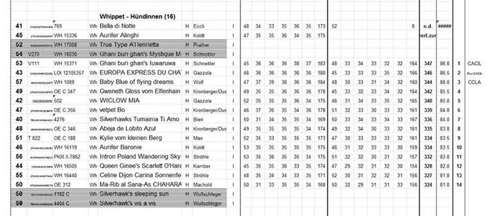 Innsbruck), das tatsächliche Ziel allerdings war Neustift. Hier war nun das zweite Schneecoursing geplant, und diesmal musste es einfach klappen! Ich hatte in den letzten Tagen versucht, Iuju wieder auf Gewicht zu bringen, die Höhenluft, die Schneewanderungen, die ungewohnte Umgebung, das alles hatte bei ihr zu einem ziemlichen Gewichtsverlust geführt, den ich nur mit Mühe wieder ausgleichen konnte. Die von Galtür leicht angegriffene Schulter hatten wir auskuriert, und Iuju war nach der Ankunft in Neustift wieder zu alter Form und den üblichen Scherzen aufgelegt. Nach dem fast hundeleeren Galtür genoss sie es, auf den Spaziergängen in Neustift mit Hunden der unterschiedlichsten Rassen zu spielen und zu rennen. Ich habe also Iuju am Morgen des 19.01. gesagt, das sie heute gewinnen soll, und Iuju hat sich das gemerkt :-) Im ersten Lauf mit Queen Ginee's Scarlet O'Hara war sie ganz deutlich überlegen, kassierte 183 Punkte und lag damit auf Rang 2. Also habe ich ihr zu Mittag gesagt, sie muss noch eine Schippe drauflegen :-) Im zweiten Parcours wurde dann deutlich strenger gewertet, allerdings konnte Iuju gegen die Laufpartnerin Baby Blue of flying Dreams, die bis dahin auf Rang 1 lag, sichtlich besser abschneiden. ![]() Iuju im zweiten Parcours, danke an Thomas Fiedler für das Foto! Und so sind dann bei der Siegerehrung meine Freudentränen geflossen, endlich bekam Iuju das Auslands-CACIL! Nun kann ich den C.I.C ( “Champion International de Course”) für sie beantragen. ![]() |