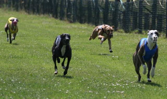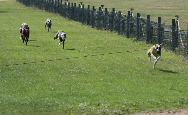 Der Zieleinlauf beim Vorlauf, Midi unter Rot, Blizz ist schon drüber über die von mir hineingemalte Ziellinie :-) Im Finale war es dann wieder so warm, dass ich mir nicht allzu viele Hoffnungen machen wollte. Da das Ding-Ding ihren Trainer beim Vorlauf beim Einfangen mal kurzerhand halb KO geschlagen hatte, haben wir die Rollen getauscht, der Trainer hat eingesetzt, ich habe das wilde Ding eingefangen. Die Reihung entsprach dem Vorlauf. Midi (unter Schwarz) hinter Hank und vor Harris und Ikara. Auf dem Bild hat sich Blizz schon mal aus dem Staub gemacht :-)