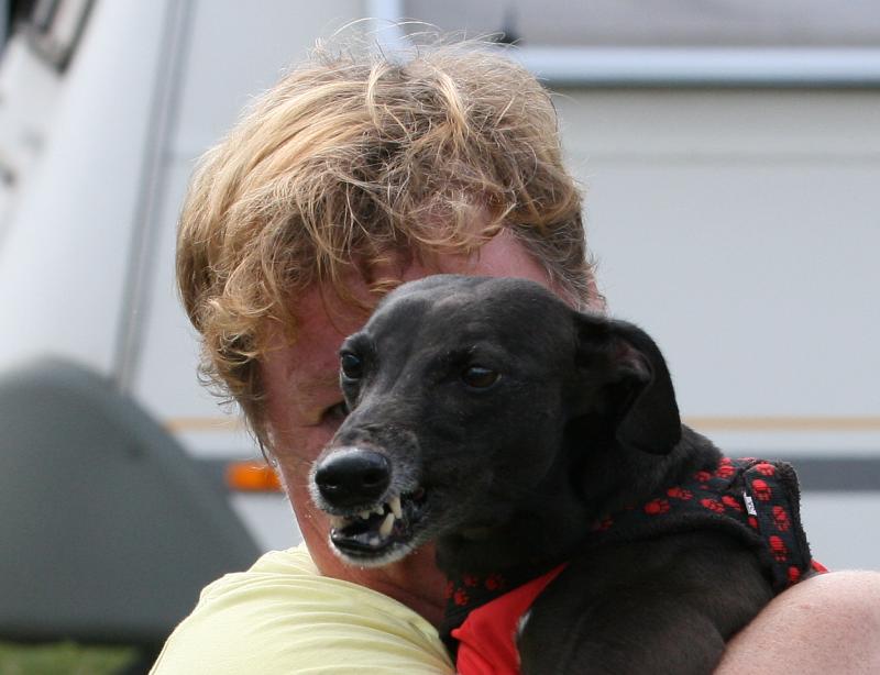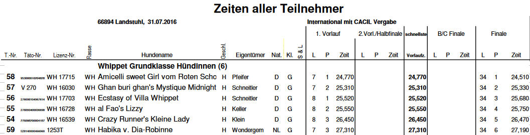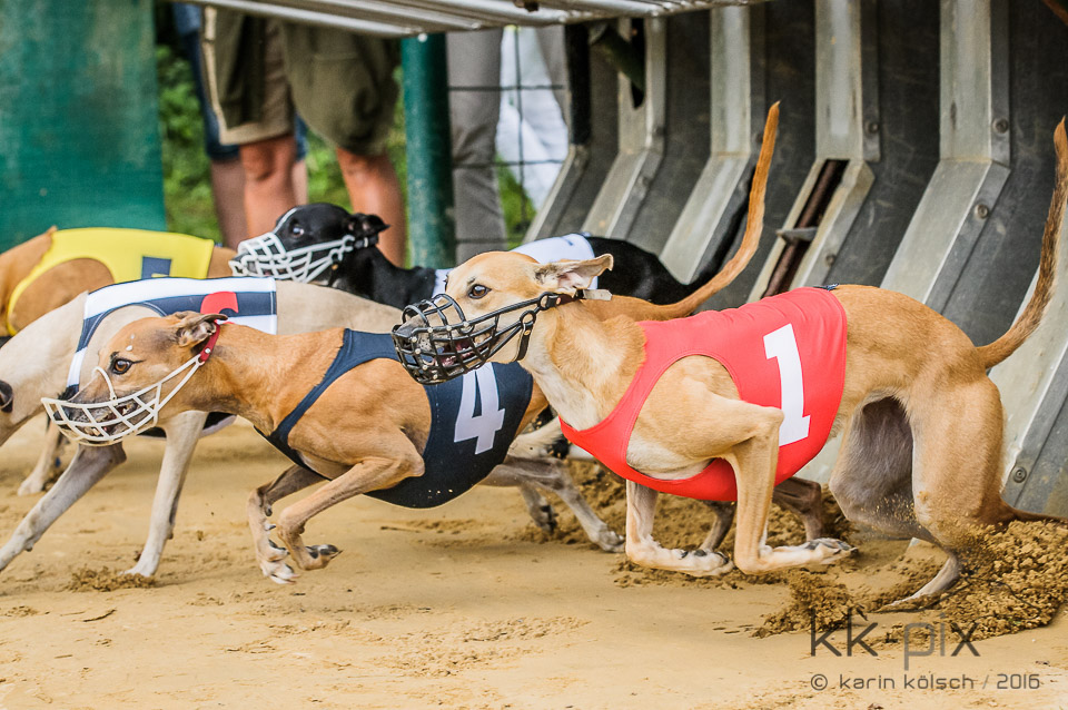 31.07.2016 LSR-Rennen in LandstuhlLandstuhl stand auf dem Programm, ich war als Bahnbeobachter eingeladen und die Mädels durften rennen. Midi mit ihren 6 Jahren lassen wir immer noch in der Grundklasse rennen, da hat sie Spaß, läuft nicht Gefahr, mit nationalen Seniorenrüden zusammen laufen zu müssen, und kann Ecsy den Weg zeigen :-) Ecstasy sorgte für mich für die Überraschung des Tages, schaffte sie es doch tatssächlich, ihren ersten Vorlauf zu gewinnen, das hat sie ja noch nie gemacht! Sie ließ al Fao's Lizzy uind Crazy Runner's Kleine Lady mal eben hinter sich und sicherte sich damit das weiße Trikot für das Finale. Midi wurde zweite hinter der jungen Amicelli sweet Girl vom Roten Schopf, und zog unter Blau ins Finale. Im Finale dann hatte Ecsy einen extrem schlechten Start, was aber in Anbetracht dessen, dass die Box seeehr spät aufgemacht wurde, kein großes Wunder ist. Ecsy hatte nach der Aktion einen kleinen Cut am linken Auge, Midi eine fette blaue Beule am Kopf :-( Der Start, Ecsy unter Weiss (Midi als Widerunner ganz aussen unter Blau nicht zu sehen), Foto Karin Kölsch ![]() kurz vor dem Ziel, ziemlich viel Dreck gefressen... Foto Karin Kölsch ![]() Das waren die Endergebnisse: ![]() Ecsy auf und Midi auf :-) hatten wir doch erst vor Kurzem :-)So ganz am Rande hat sich Iuju noch von der Landstuhler Bahn verabschiedet. Sie hat hier ihr erstes CACIL geholt, sie hat hier dieses eine Mal im Leben ihre größte Konkurrentin Xantana hinter sich gelassen, sie hat diese Bahn immer gemocht. Demzufolge ist ihr Abschied auch nicht gerade leise gewesen ;-)