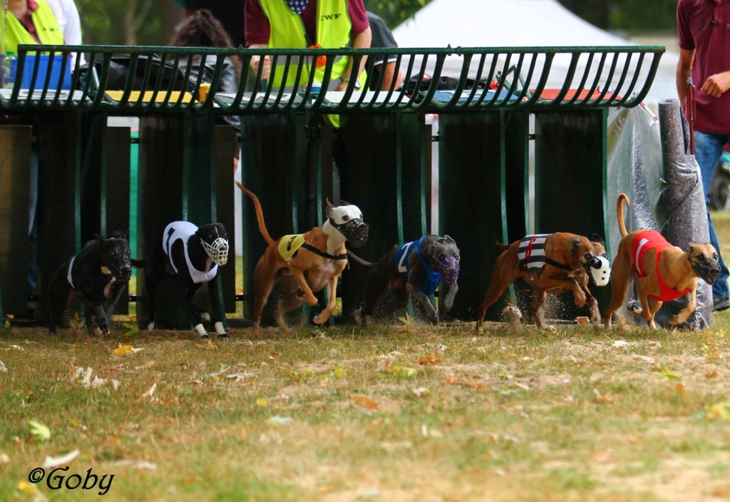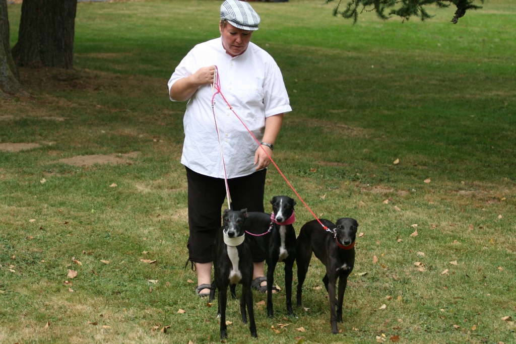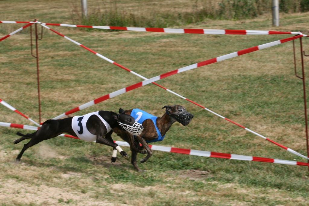 04.09.2016 Silberpokal-Rennen in Bad HomburgEigentlich hatte ich Iuju ja vor 8 Jahren mal versprochen, dass sie auf dieser Bahn nicht rennen muß. Aber Iuju hat sich im Verlauf ihrer sportlichen Laufbahn zu einem hervorragenden Coursinghund entwickelt, so daß ich mir sicher war, dass sie auch dieses Abenteuer gut überstehen würde. Dass sich sowohl Iuju als auch Midi jeweils im Finale heftig die Ballen aufreißen würden, war nicht vorauszusehen, aber der Sand, mit dem die provisorische Piste ein wenig ebener gestaltet werden sollte, hat wohl nach dem Abtrocknen eine ziemlich gute Scheuerwirkung erreicht, und Midi und Iuju sind nun mal immer dazu geneigt, sich mit vollem Körpereinsatz auf den Hasen zu werfen. Geplant war, Iuju und Midi bei den Senioren und Ecsy in der Grundklasse laufen zu lassen, da es momentan so aussieht, als ob sich Ecsy nicht an Midi vorbei traut. Aber dann war da die Martina Wiesinger aus Östereich, die gern ihre Hündin Dévaj Go by laufen lassen wollte, und da diese noch nicht alt genug für die Senioren war, hätte sie in der A-Klasse starten müssen, für die aber ansonsten keine Meldungen vorlagen. Sollten wir sie nach Hause schicken? Also haben wir kurz entschlossen die andere Seniorin von Martina (Dévaj Wildcat) und Iuju zusammen mit Go by in ein kleines A-Klasse-Feld gesetzt. Midi musste nun in Ermangelung weiterer Senioren mit in die gemischte Grundklasse, in der auch Ecsy und deren Bruder Eaglehawk liefen. Bei Midis erstem Lauf blieb mir beinahe das Herz stehen. Midi ist ja einen echte Widerunnerin, geht also nach dem Start wirklich ganz nach rechts. Dumm nur, dass bei dieser improvisierten Bahn etwa 10 Meter hinter dem Start der rechte Bahnrand etwas nach Innen zieht. Fast wäre Midi da draufgelaufen, im letzten Augenblick konnte sie noch ausweichen. Glücklicherweise hat sie es sich für den Rest des Tages gemerkt, aber für das Finale hatte ich dann schon wieder Bauchgrummeln, die Bahn war ja nicht nur nach dem Start eingeengt sondern auch generell sehr schmal, so dass in einem 6-er Feld nicht viel Platz zum Ausweichen ist. Glücklicherweise musste der Chef die Midi einsetzen, weil Ecsy auch mit im Finale war und meine ordnende Hand brauchte :-) Auf die Genauigkeit der handgestoppten Zeiten möchte ich nicht weiter eingehen, ich denke zwar, das Midis zweite Vorlaufzeit deutlich besser war als Ecsys, aber ob nun Midi unter Weiß und Ecsy unter Schwarz ins Finale geht oder umgekehrt, ist ja egal :-) In der A-Klasse haben sich die Mädels im Finale exakt daran gehalten, alles genau so zu machen wie im Vorlauf :-) Angefangen von der Boxenzulosung, Iuju durfte wieder in die 1, bis hin zum Zieleinlauf, Go by vor Wildcat und Iuju als Älteste auf Platz 3.