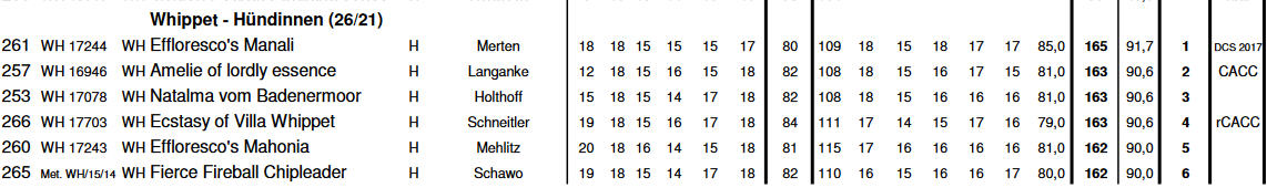 nichts passieren, also bin ich dann mal hingefahren. Wie schon im Frühjahr in Babenhausen ging Ecsy im ersten Lauf mit Firce Fireball Chipleader an den Start. Beinahe wäre es nicht dazu gekommen, denn 2 Läufe vor uns hat sich ein Whippetmädchen das Bein gebrochen, mir war kotzübel, ich hatte Angst, und wenn mein Laufpartner nicht gewesen wäre, hätte ich zurückgezogen. Und auch unser Lauf war nun nicht wirklich schön, es wurde extrem kurz gezogen (später wurde mir erzählt, das dies nicht Absicht war sondern an der viel zu matten Maschine lag, die bei Whippettempo einfach nicht mithalten kann), Ecsy unter Rot startete Rechts, Lucy Links, der Parcours bog nach der ersten Rolle nach Rechts ab, Ecsy wollte wie immer extrem folgen, Lucy wollte abkürzen, rumms, eine heftige Kollision, die bei entsprechend weit vorgezogenem Hasen zu vermeiden gewesen wäre. Im weiteren Verlauf überrannten die Mädels den Hasen, Ecsy stand auch mal ganz kurz auf dem Seil (glücklicherweise war die Haut nur gereizt, nicht durchtrennt). Kaum zu glauben, dass dieser Lauf Ecsy die Höchstpunktzahl bei den Mädels brachte. Aber mir war irgendwie schon klar, dass das Heute nicht reichen würde. Lauf 2 dann mit Lara, die ein Pünktchen weniger als Ecsy auf dem Konto hatte. Der Parcours ein Acker mit spärlichem Bewuchs, auf dem ich am Abend bis zum Schwinden des Lichtes noch fleissig Steine abgelesen hatte. Bei Regen wäre er für mich definitiv nicht akzeptabel gewesen. Aber es blieb glücklicherweise trocken. Hier wurde nun eher der Hase vorgezogen, teilweise wohl sogar ein bissl viel, zwei Hunde verloren in ihrem Lauf gemeinsam den Hasen, was nach Allem, was ich inzwischen gelernt habe, wohl einen Neustart hätte nach sich ziehen müssen. War aber nicht so, damit waren die beiden Hunde raus aus der Wertung. Ecsy hat wieder gejagd wie der Teufel, aber an einer Stelle hat auch sie sich mal kurz nach dem Hasen orientieren müssen. Das wurde wohl von den Richterinnen als Mangel an Jagdlust, Intelligenz und Geschick gewertet und jede Menge Punkte gezogen. Lara und Ecsy kamen punktgleich mit mageren 79 Pünktchen raus. In der Summe landete das Mupfelchen dann auf Rang 4, punkgleich mit Rang 2 und 3, und erhielt ein Reserve-CACC. ![]() Im Nachhinein bin ich nur froh, dass Ecsy nichts weiter passiert ist. Das kleine Whippetmädchen, das sich das Bein gebrochen hatte, wurde am nächsten Tag operiert, und ist 2 Stunden nach der Op leider verstorben. ![]() |