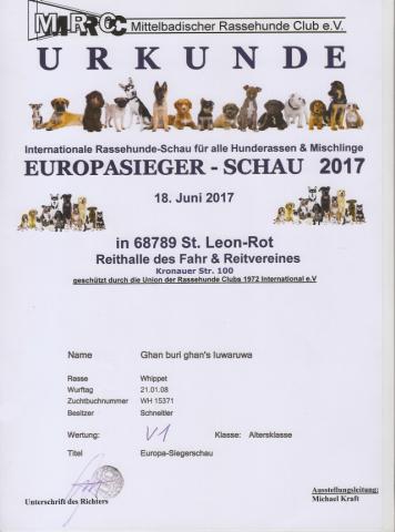 "Europasieger" geworden *gg* --------------------------------------------------------------------------------------------------------------![]() Zu Info für die Leute, die meiner Seite mit eher weniger wohlwollender Intention folgen - Iuju darf im VDH laut Ausstellungsordnung nicht mehr ausgestellt werden, und ich lasse mir weder verbieten, mit ihr an Jederhundrennen, Sackhüpfen oder Eierwerfen noch an solchen Shows teilzunehmen, solange sie das gesundheitlich problemlos kann und Spass daran hat :-) ----------------------------------------------------------------------------------------------------- 15.06.207 - Unsere Veranstaltung "Pferd & Hund" im RFV St.Leon war ein voller Erfolg, hier geht es zur Ergebnisliste des Hunderennen Hier ist das Webalbum mit vielen Rennbildern ![]() ----------------------------------------------------------------------------------------------------- 11.06.2017 zweite Etappe der DVM-Qalies Agility, Die Mädels waren brav. Meine Mannschaft hat sich den in