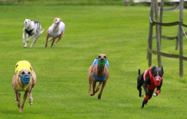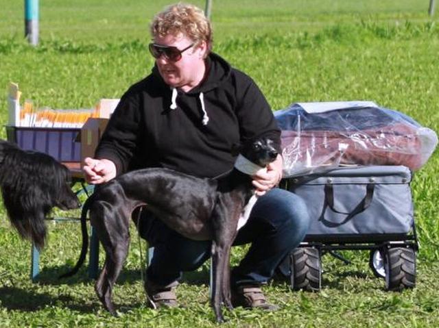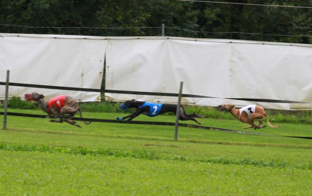 hinterherlaufen :-) ---hier ein Video---Der bewegende Moment danach - Midi wurde verabschiedet, das war ihr letztes Rennen in Lorch (glücklicherweise hat uns der schnuffelige Afghane ein wenig abgelenkt :-) ) Siegerehrung Senioren MädelsEcsy ging in der Grundklasse mit Crazy Runner's Mabel, Mortimer's O'Hara , Josie of Mystical Wooden House und Nine lives Vanilla Sky an den Start. Mabel und O'Hara kennen wir jha schon länger, und es hat mich total gefreut, das Ecsy dieses Mal gut mithalten konnte. Immherhin hat sie ja nicht diese immense Praxis im Rennen, genau genommen war es ja erst ihr fünftes Rennen im Feld überhaupt. Beim ersten Lauf hat sie sich aus Box 6 wieder mal Richtung Rail wühlen wollen, das kostet Kaft und Energie, und geklappt hat es natürlich auch nicht, dazu hat sie viel weniger Gewicht als ihre Kontrahentinnen :-) Aber sie ist dann schön gelaufen, hat lange geführt, bis Mabel kurz nach Kurve 4 vorbei ging. Ecsys Zeit im ersten Lauf 23,50 (Mabel 23,39), das war nicht rasend schnell, aber in Anbetracht des schweren nassen Bodens ok.