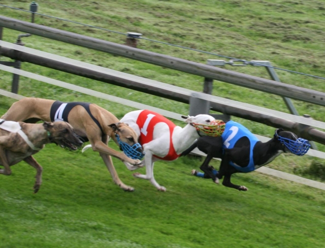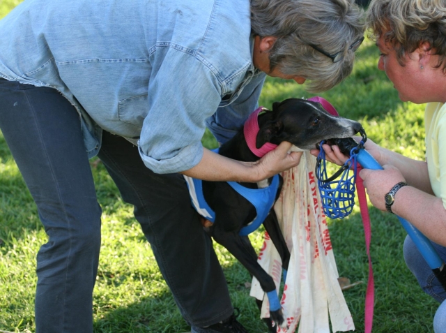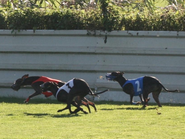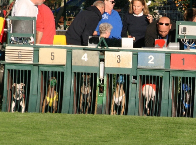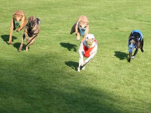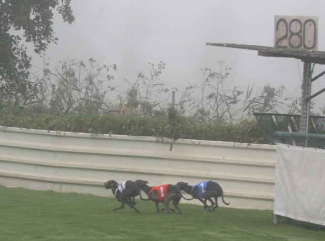 Da musste der Papa ordentlich mit ran. ![]() Zumal das diesjährige Hubertusrennen wohl unter keinem guten Stern stand. Pleiten, Pech und Pannen den ganzen Tag, beginnend mit einer Tierärztin, die verschlafen hatte und so den ganzen Ablauf schon mal ins Wanken brachte, über Teilnehmer, die sich nicht mehr an die Ausschreibung halten wollten (ja, man hätte auch von vorne herein einen Schaulauf als Abschiedlauf melden können, wenn man seinem Senior nicht 2 Läufe zumuten will), zähem kalten Nebel, der einfach nicht weichen wollte, diverse Programmumstellungen, die obwohl regelkonform nicht das Gefallen der Teilnehmer fanden, dann ging es an die technischen Pannen, die sicher teilweise auch witterungsbedingt waren. Das Seilchen riss diverese Male, später musste das Hauptseil geändert werden, Startboxen arbeiteten nicht so, wie sie sollten, irgendwie war überall der Teufel drin. Einige Teilnehmer reagierten bei Pannen völlig sachlich, aber einige Andere beschimpften und bedrohten die Funktionäre, ja, so macht Windhundesport wirklich Spass Die ersten Vorläufe gingen bis kurz vor 14 Uhr, da war dann auch das Essen alle, denn die Teilnehmer hatten ob der langen Unterbrechungen schlicht nichts weiter zu tun als zu essen. Als wir als Schiedsgericht entschieden, statt der 2.Vorläufe, die zeittechnisch unter diesen Bedingungen gar nicht machbar waren, lieber noch ein paar weitere technische Läufe zum Testen der Bahn ziehen zu lassen, traf das bei einigen Teilnehmern, deren Hunde dann leider nicht im Finale waren, auch nicht gerade auf Gegenliebe. Es war ja immerhin ein Titelrennen, und viele hatten sich Hoffnungen auf das Landessiegerdeckchen gemacht. Warum auch einige Teilnehmer, deren Hunde im Finale waren, auf 2.Vorläufe bestehen wollten, ging mir nicht wirklich ein, es lag wohl an diesem verrückten Tag oder irgendwelchen persönlichen Animositäten. Wie richtig unsere Entscheidung war, die zweiten Vorläufe zu streichen, sah man spätestens daran, dass das Ende der Siegerehrung im Dunkeln stattfand. Ein paar fehlende Einträge in den Hundepässen habe ich auch noch schnell korrigiert, bevor wir endlich nach Hause konnten, aber da viele Teilnehmer schon weg waren, weiss ich nicht, ob das die letzten Pässe waren, die nachgetragen werden mussten. Aber nun zu den Läufen der Mädels. Im Vorfeld hatte ich noch den Hündinnen-Seniorenlauf neu aufgestellt, da beide zuvor gemeldete Hündinnen zurückgezogen wurden. Aber es gibt ein paar Leute, die halten zusammen, und so konnte ich die Besitzer von Motte und von Midis ein Jahr jüngerer Halbschwester Rose davon überzeugen, mit uns zu laufen, ein schöner Abschiedslauf für Midi und Motte, und auch Rose sollte nicht leer ausgehen. Der erste Lauf fand im dicken Nebel statt, obwohl wir schon gut 30 Minuten nach der offiziell angekündigten Startzeit dran waren. Wie erwartet setzte sich Rose (Rot) ab, Midi (Blau) verfolge sie, und Motte (Weiss) trieb die beiden tapfer vor sich her. Vorlauf Senioren MädelsEcsy (Blau) ging in der Grundklasse mit Crazy Runner's Mabel (Schwarz), Wallo from Meatloaf (Weiss) und Shannon Down Bread&Butter at Xcalibur (Rot) an den Start. Dieses Mal wollte sich Ecsy nichts vormachen lassen, sie sprang blitzschnell aus der Box, führte das Feld bis in Kurve 3 (obwohl sie in Kurve 2 einen heftigen wenn auch regelkonformen Bodycheck von Beebee einfing) wo Beebee sie dann doch noch überholte. Insgesamt war das die zweitbeste Zeit der sieben Grundklassehündinnen, im anderen Lauf waren Mortimer's O'Hara, Aponi of Goldenblue und Simply Heurekas Inala, die sich alle hinten anstellen mussten.