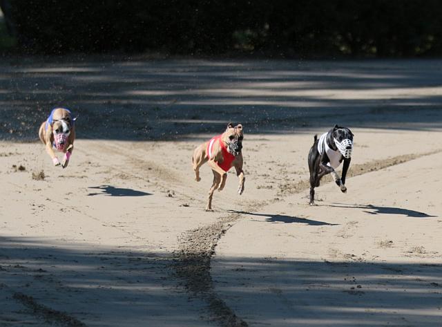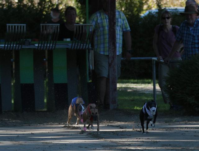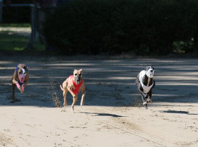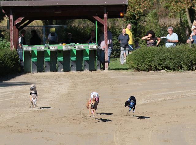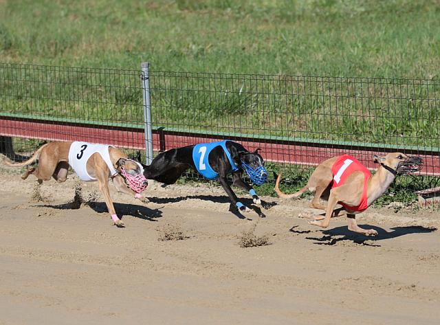 Ecsy unter Blau lässt sich überholen So sah das Finale also nur noch 3 Hündinnen, und Ecsy zog sich das feine weisse Leibchen an. Wir hatten eine ähnliche Konstellation wie beim Vorlauf gewählt, Ecsy innen, das war auch ganz gut so, denn sie schoss wieder wie eine Kanonenkugel raus.