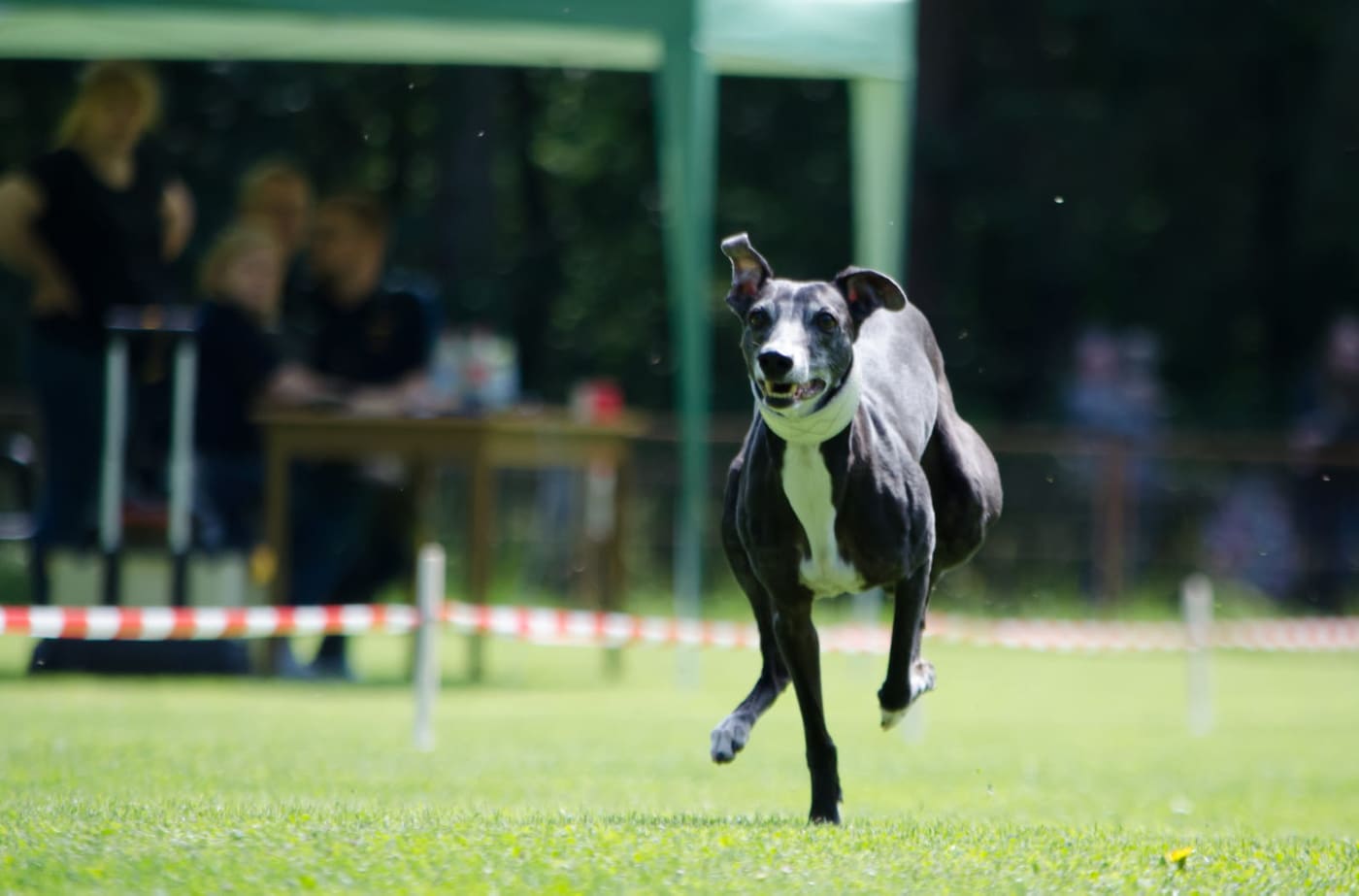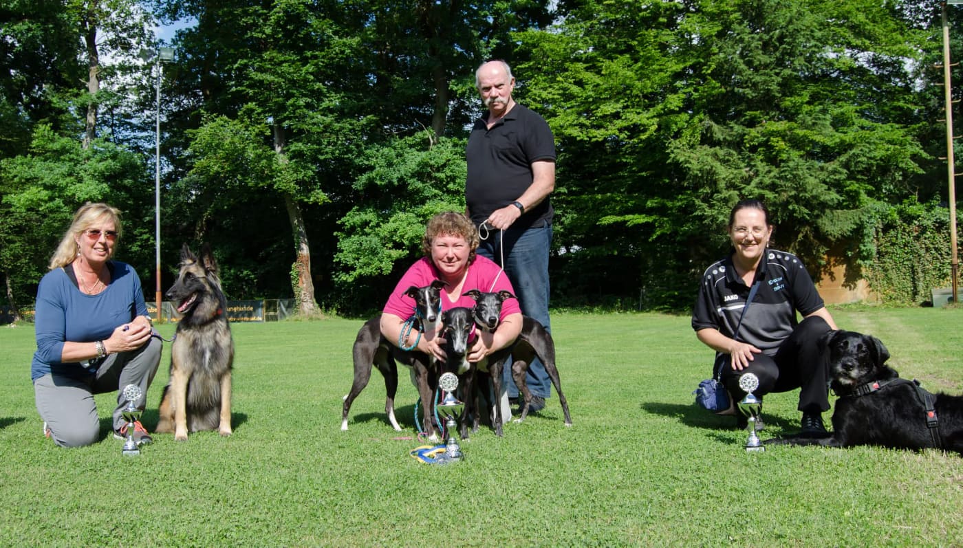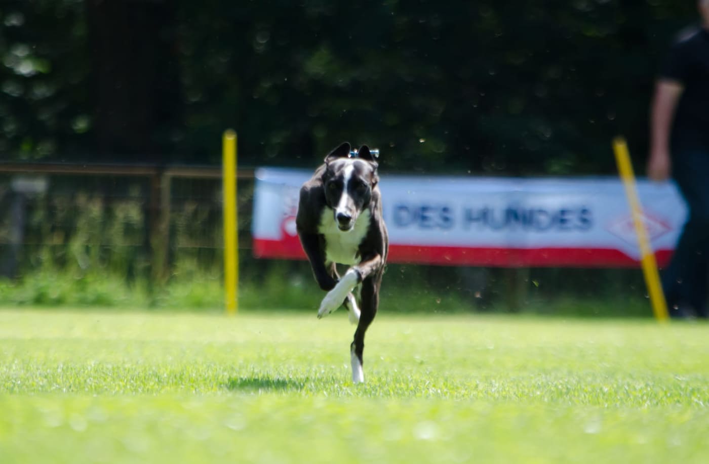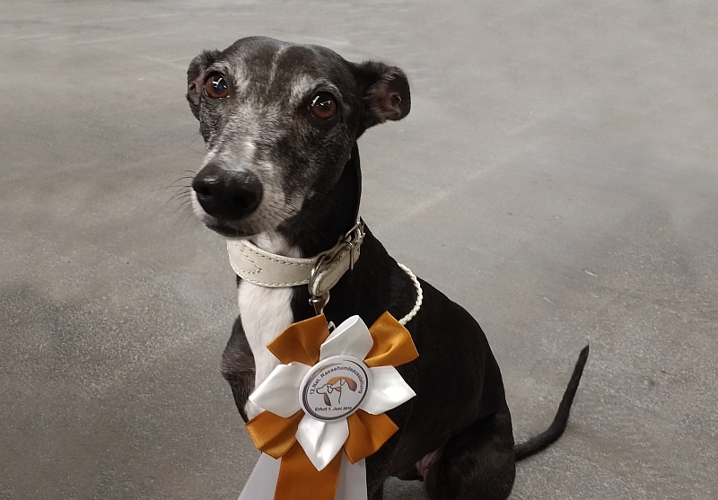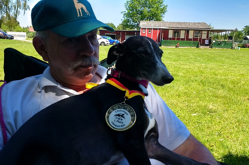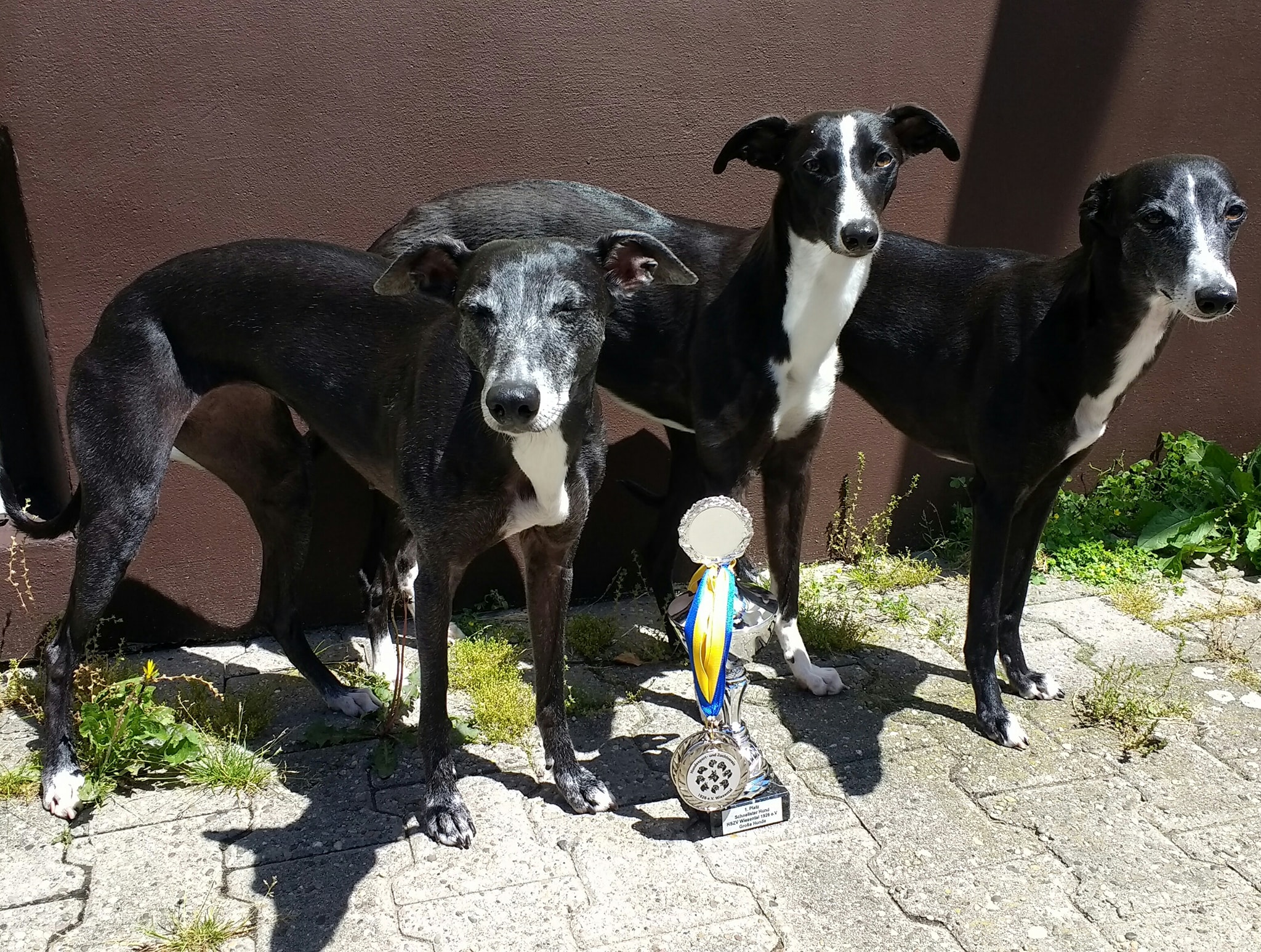 -------------------------------------------------zurück zu den News-------------------------------------------------17.06.2019 Und die Natur macht weiter! Einen Tag nach Ecsy hat sich auch unsere Emma dazu entschlossen, heiss zu werden. --------------------------------------------------------------------------------------------------------------Ich mag es ja, meinen Hunden bei den Entwicklungssprüngen zuzusehen, die sie mit jeder Hitze machen, und bei der ersten Läufigkeit ist es am allerspannendsten :) Ab jetzt ist unsere Emma also eine junge Lady (hoffen wir mal...) ![]() ----------------------------------------------------------------------------------------------------- 16.06.2019 Wir lassen uns die Laune nicht verderben! Wenn wir nicht zur EM fahren und auch nicht zu normalen Trainings auf die Windhunderennbahnen können (wo man aus unerfindlichen Gründen immer noch nicht mit heissen Hündinnen umgehen kann), dann machen wir eben die Jederhundrennen der Region unsicher :) Dieses Mal sind wir beim "Tag des Hundes" in Wiesental aufgekreuzt, hatten einen schönen Tag und beim "Jederhundrennen für alle Rassen" hat Midi mit 3,63 Sekunden den dritten Platz geholt, danach hat Ecsy mit 3,59 Sekunden den zweiten Platz eingestellt, und unser kleiner Schadnager Emma hat wohl beim Zerlegen der Liegematte im Auto irgend eine tolle Substanz gefunden und sich so mit 3,13 Sekunden an die Spitze katapultiert. In Absprache mit dem Verein haben wir die 3 Mädels zusammen auf den ersten Platz gesetzt, so dass Platz 2 und Platz 3 wieder frei waren für Hunde anderer Rassen :) ![]() Die Siegerehrung, Midi, Ecsy und Emma auf Platz 1. Danke an Sabrina für das Foto! ![]() Emma flitzt, danke an Sabrina für das Foto! ![]() Midi hat Spaß. Danke an Sabrina für das Foto! ![]() Die drei Grazien mit der Beute :) ----------------------------------------------------------------------------------------------------- 16.06.2019 Nur wenige Tage vor der geplanten Abfahrt zur EM hat Ecsy sich entschlossen, Iuju und Midi mit der Hitze nachzuziehen. ![]() Damit ist die EM für uns leider schon vorbei ![]() 02.06.2019 Clubsiegerrennen in Offenbach, Ecsy nimmt am Solorennen teil und holt sich , Bericht