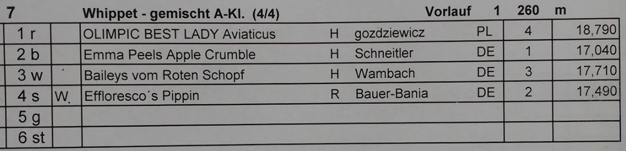 der Meute hüten, also sind Emma und ich allein an den Bodensee gedüst. Seit 13 Jahren bin ich jetzt im Rennzirkus unterwegs, Landesssiegerrennen haben sich seitdem doch ziemlich gewandelt. Zu Iujus und Midis aktiver Zeit war es uns gar nicht möglich, an LSR teilzunehmen, weil unsere Landesgruppe konsequent keine LSR mehr ausgerichtet hat (viel zu teuer, ausserdem lief da angeblich nur "Not gegen Elend"), man aber nur in der Landesgruppe am LSR teilnehmen durfte, in der man ansässig war. LSR mehrerer Landesgruppen zusammenzulegen, um Kosten zu sparen und mehr Teilnehmer zu haben, war für die Landesfürsten auch keine Option, man fürchtete offensichtlich, dass man damit der Abschaffung der Landesgruppen Tür und Tor öffnen würde. Später wurden die LSR geöffnet und normalen Rennen angegliedert, ein paar Jahre lang gab es ziemlich Kuddelmuddel, bis sich alles eingespielt hatte. Trotzdem erstaunt es, dass so wenige Windhundler den Weg zu den LSR finden. Trotz Änderung der Kriterien war unsere Ecsy übrigens nicht unbedingt dafür prädestiniert, ihre Landessiegertitel im Rennen zu holen, sie hat es dann dafür im Coursing gemacht. Das LSR-Deckchen von Bermatingen für Emma hätte uns schon gefallen, aber es musste in der gemischten A-Klasse, in der letztendlich 4 Hunde am Start waren (eine Seniorenhündin aus Polen wollte dann auch noch mitlaufen) auch erst mal erkämpft werden. Der Vorlauf sah die polnische Hündin Olimpic Best Lady Aviaticus (Metka) unter Rot, Emma unter Blau, Baileys vom Roten Schopf unter Weiss und den einzigen Rüden Effloresco's Pippin (Chester) unter Schwarz. Chester war irgendwie auch der Einzige, der Emma trotz Start aus der ungeliebten Box 4 irgendwie gefährlich werden konnte. Kurz vor dem Ziel wollte Chester dann auch an Emma aufschliessen, aber da ist sie wach geworden und hat noch mal Gas gegeben und war mit gut 2 Hundelängen vor Chester im Ziel.