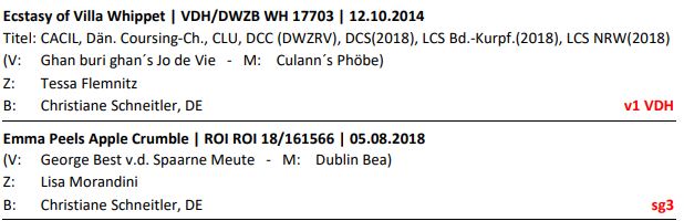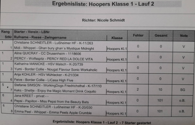 -------------------------------------------------zurück zu den News-------------------------------------------------28.08.2022 Rennen in Freiburg, Emma verletzt sich leider schwer, Ecsy holt sich dafür im Solorennen und wird sehr lieb verabschiedet, Rennbericht hier![]() ----------------------------------------------------------------------------------------------------- 27.08.2022 CAC in Freiburg, Emma holt sich das SG3, Ecsy schiesst den Vogel ab, holt sich das V1 und wird beim Gebrauchshunde-BOB Zweite! Showbericht hier ![]() ![]() ----------------------------------------------------------------------------------------------------- 20.08.2022 Hoopers in Östringen, Midi holt sich im H1 im zweiten Lauf , Hoopersbericht hier![]() ----------------------------------------------------------------------------------------------------- 19.08.2022 Agility in Hemsbach. Emma holt sich in der Second Chance ,
