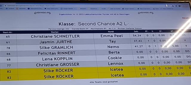 Chance A2, Agilitybericht hier![]() ![]() ----------------------------------------------------------------------------------------------------- 11.12.2022 St. Leon sucht die GraueSuperPfote, dieses Jahr hat es die Iuju gemeinsam mit einem anderen Hundel auf das vorderste Plätzchen der GrauenSuperPfote geschafft, das lag sicher auch an ihren phänomenalen Würfelskills :) , auch Midi und Ecsy haben sich - jeweils unter der Führung von lieben Freundinnen - tapfer geschlagen. Und Imke hat mit Emma die Klasse der SchwarzenPfoten geknackt, das hat mich sehr gefreut, es war faszinierend dabei zuzusehen, wie brav und akkurat meine Hunde mit anderen Leuten arbeiten. Hier ein paar Schnappschüsse: ![]() ![]() ![]() ![]() ----------------------------------------------------------------------------------------------------- | ||