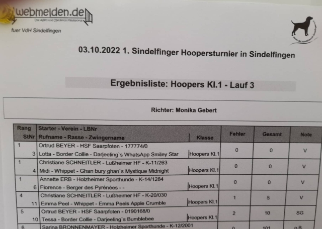 Lizenzlauf (nur diesesmal stand "Ende" drauf -------------------------------------------------------------------------------------------------------------- )!![]() Danke an Petra Müller für die tollen Rennbilder! ![]() Danke an den WRV Kurpfalz für die nette Verabschiedung und das tolle Präsent, zusammengestellt von der Firma Laub! ![]() ----------------------------------------------------------------------------------------------------- 12.10.2022 Happy birthday, kleine Ecsy! 8 Jahre bist Du nun schon auf dieser verrückten Welt! ![]() ----------------------------------------------------------------------------------------------------- 03.10.2022 Am Tag der deutschen Einheit waren wir in Sindelfingen hoopern, Hoopersbericht hier ![]() die Ergebnisse des dritten Laufs, das haben die Mädels gut gemacht! | ||