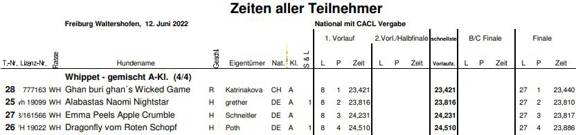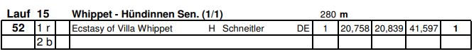 mache ich nicht mehr... Da für Ecsy mangels weiterer Teilnehmer kein Seniorenlauf zustande kam, durfte sie im pinken Deckchen am Solorennen teilnehmen, weches sie souverän gegen sich selbst gewann :) Emma lief im gemischten Feld der A-Klasse, diesmal völlig unter Wert. Die Bahn war zwar extrem schwer und die Zeiten bei allen Teilnehmern jenseits von gut und böse, aber die bewusste Vorführung am Vortag führte sehr wahrscheinlich dazu, dass die Kurze nicht abliefern konnte. Im Vorlauf wurde nicht wie angekündigt freie Boxenwahl gemacht sondern mal eben geschüttelt und gesetzt, was dazu führte, dass Emma, die immer nach innen will, in Box 4 landete, Lilly hingegen, die sich aussen am wohlsten fühlt, in Box 3 saß. Es kam wie es kommen musste - die Beiden rieben sich gegeneinander auf und Théo und Naomi konnten sich freilaufen. Das Finale erlaubte uns dann wenigstens Box 3, und diese Mal lief Emma nach echt bescheidenem Start auf Théo auf und machte sich so die Zeit schon wieder kaputt. Naomi konnte Emma dann ganz kurz vor dem Ziel noch einholen und die Nase vorstrecken. ![]() |
