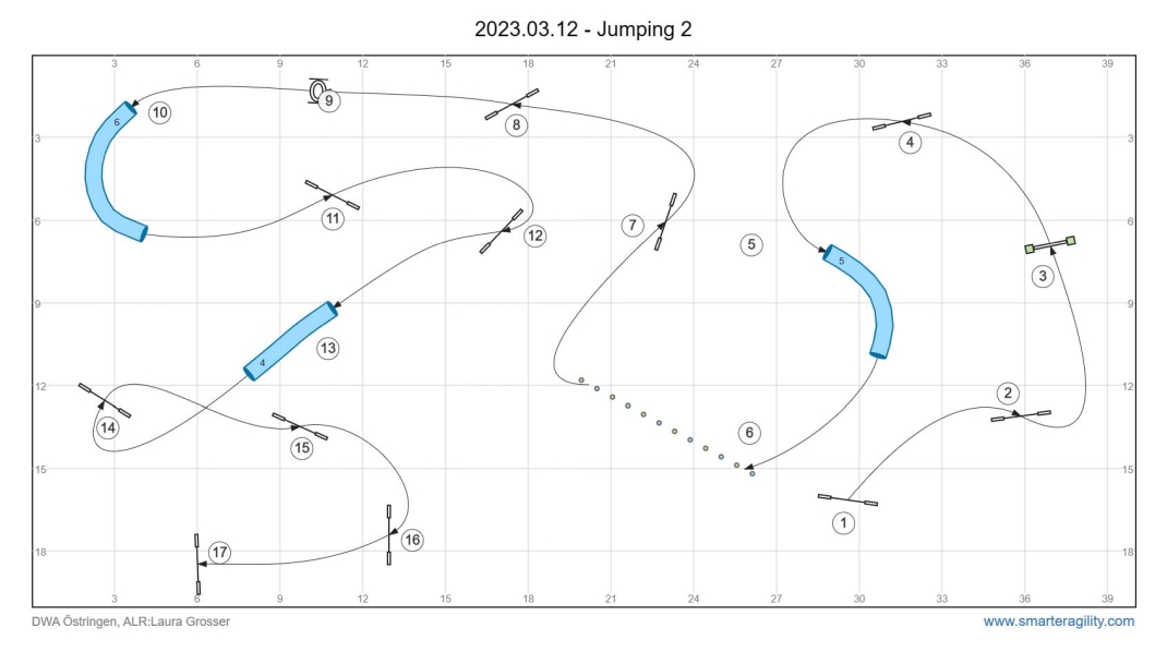 dürfen :) A2-Lauf Emma: Die Zonen waren ok, ein kleiner doofer Ausflug vor der 4 aber noch zu retten, bei der 15 auf die 16 musste ich hinter dem Steg bleiben, sonst wäre Emma 200%ig auf die Wippe gerannt. Den Slalom hat sie auch noch getroffen, aber leider ist sie kurz vor Schluß ausgefädelt. Da es auch noch eine Ewigkeit gedauert hat, bis ich bei ihr war und sie korrigieren konnte, gab es on Top noch Zeitfehler, aber egal, eine Quali war es ja sowieso nicht. Ein SG Rang 8 von 20. Jumping2-Lauf Emma: entweder war sie müde oder irgendwas hat sie irritiert, jedenfalls wollte sie schon nicht loslaufen, die 7 hat sie dann verfehlt und ich habe sie nicht korrigiert. DIS |