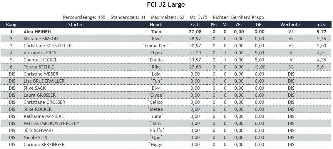 gegenwärtigen Schwierigkeitsscala, der Jumping gefällig. A2-Lauf Emma: Schon am Start sah ich das erste Problem, der hund schaute egal wie man es drehte oder wendete über den Sprung1 auf den Laufsteg. Entsprechend habe ich den Start abgesichert und war deshalb viel zu spät um Emma beim Slalom zu helfen. Sie drehte rum und rannte erst mal auf den Steg :) DIS Jumping2-Lauf Emma: ja, der Start war verlockend aber ich habe auch gesehen, dass es die Hunde nach dem Tunnel 3 gern zwischen 4 und 5 zog, da musste man auf die 4 schon ein wenig drücken. Der Rest dann relativ easy wenn man einen Hund hat der das Aussen halbwegs selbständig annimmt. Ein paar größere Bögen kosteten Zeit, aber das war ok, Emma lief fehlerfrei auf , als Quali
