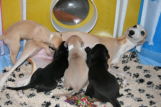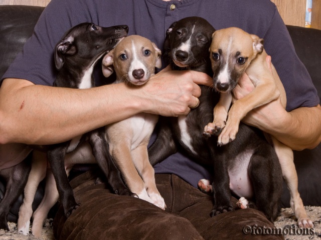 ------------28.12.2009--------------------- Dunja Stähler, das Frauchen von Iujus Bruder Finwe, hat klasse Bilder von den Babies gemacht: erst mal Midi mit ihren Brüdern (Midi ganz links, dann unser Rüden-Favorit Mandarin Mustang, dann der dicke Moon Quake Shake, und ganz rechts Maiden Blush)